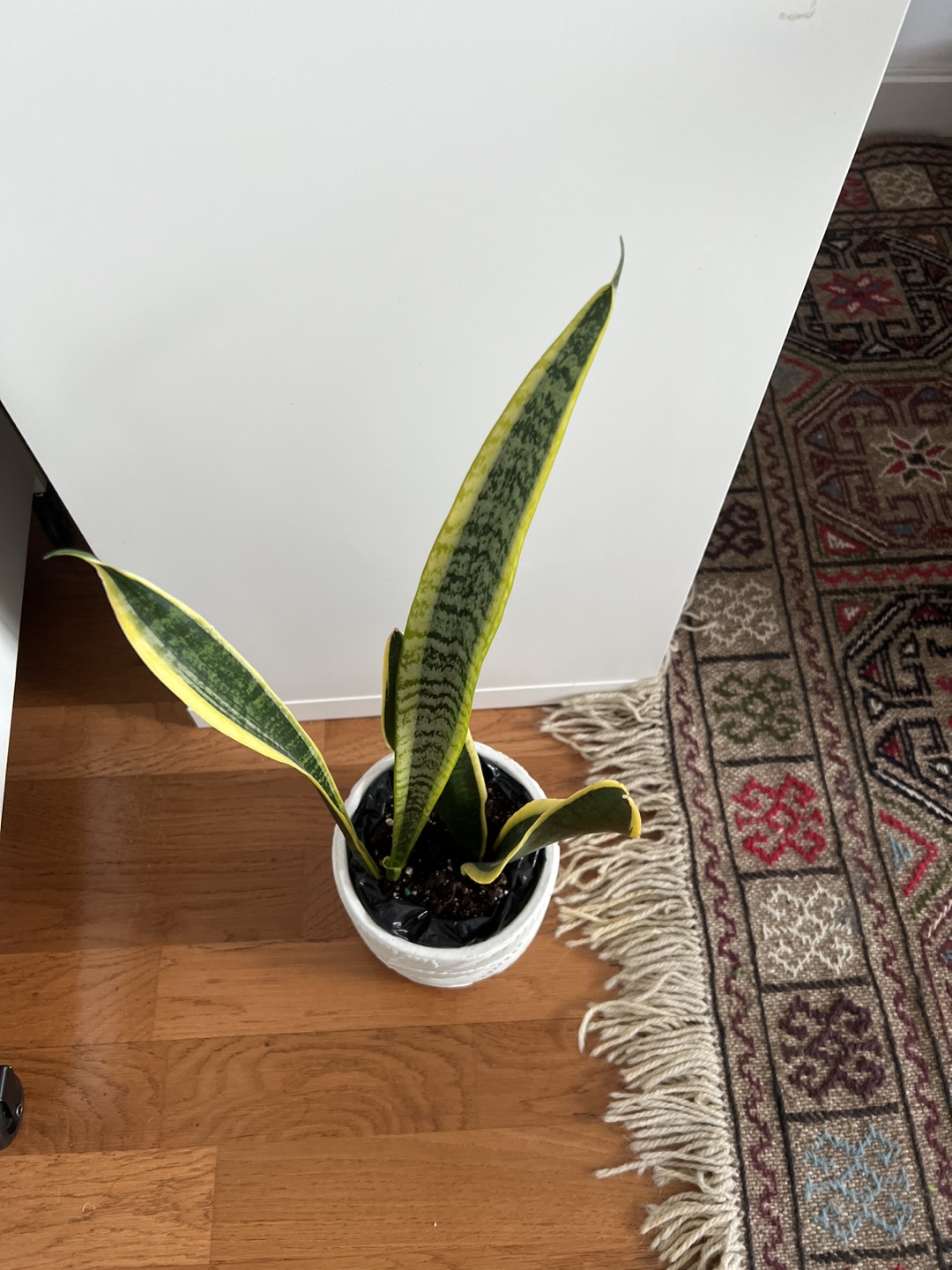 Snake plant in white leaf pot