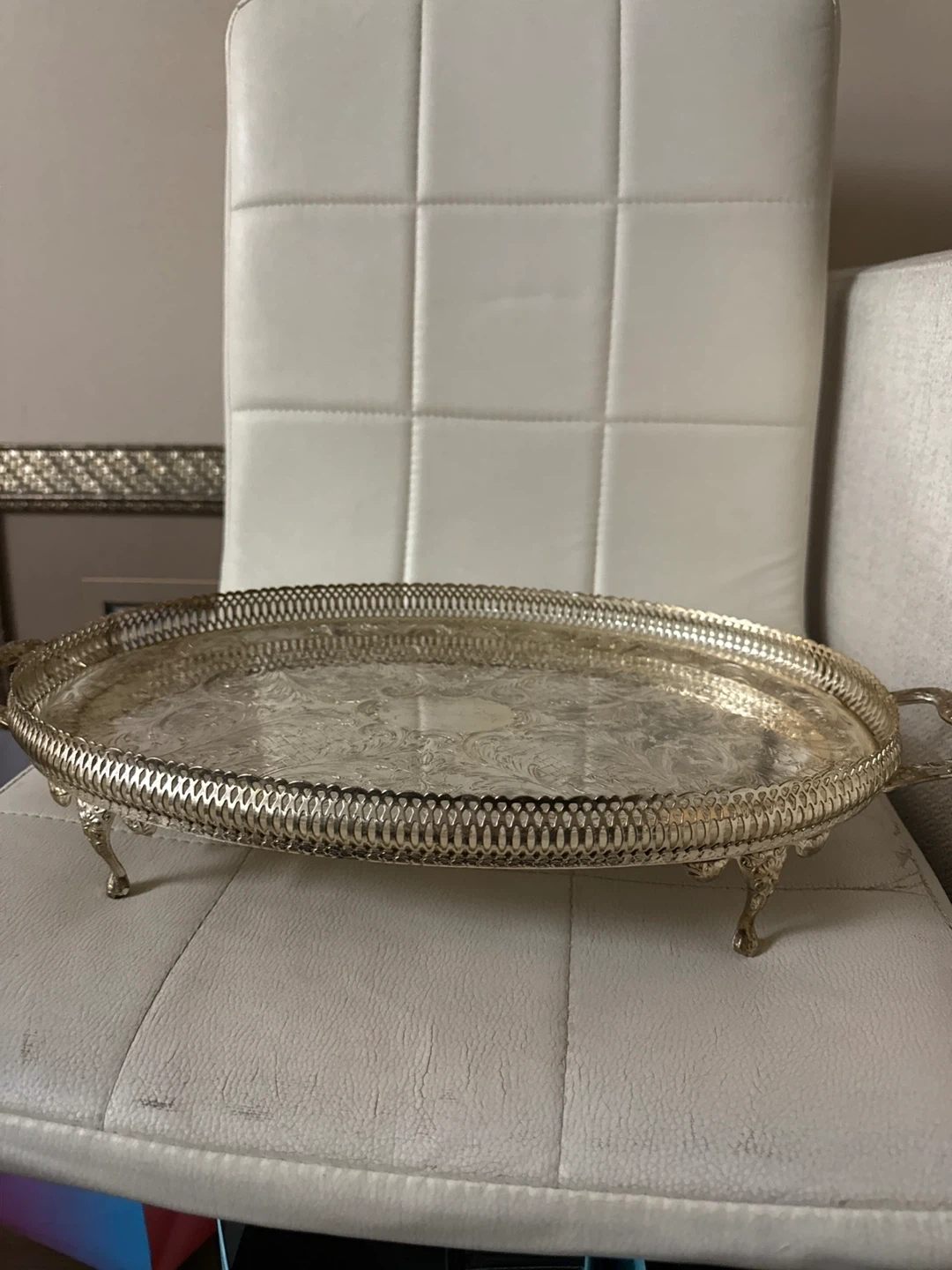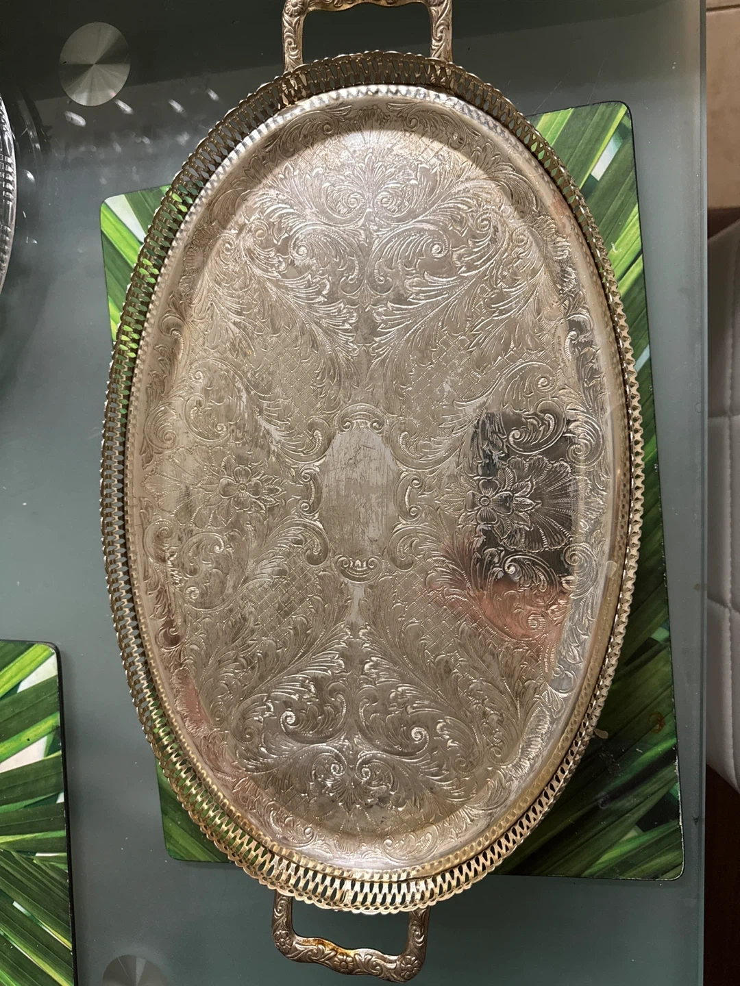 This is a vintage-style oval serving tray, ornately decorated with floral patterns. It's silver-plated and features two convenient handles for carrying. Its decorative edging and embossed design make it a statement piece for serving guests.