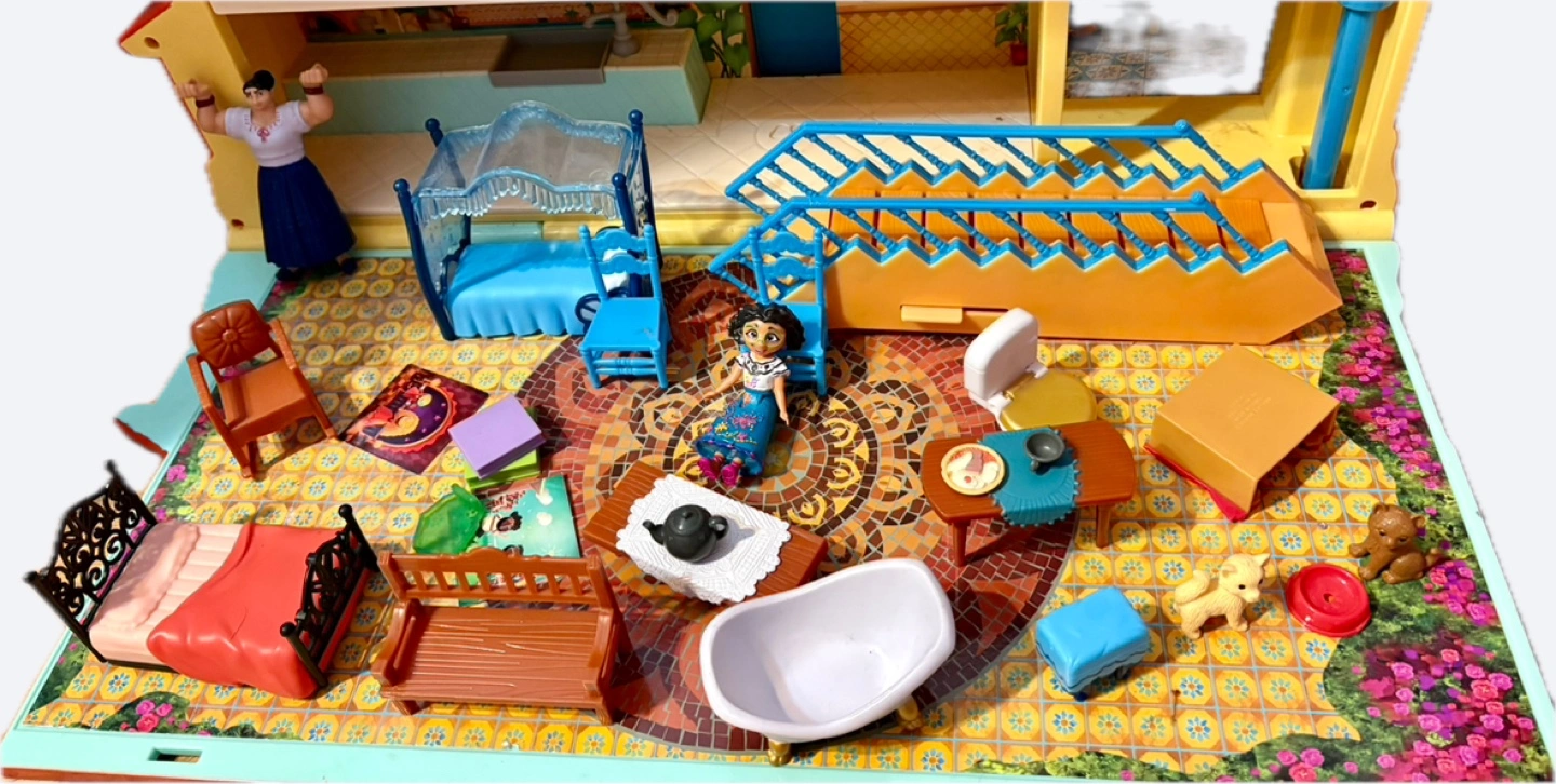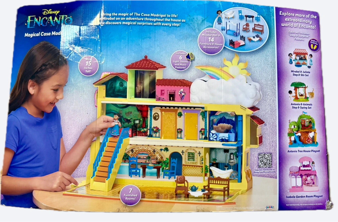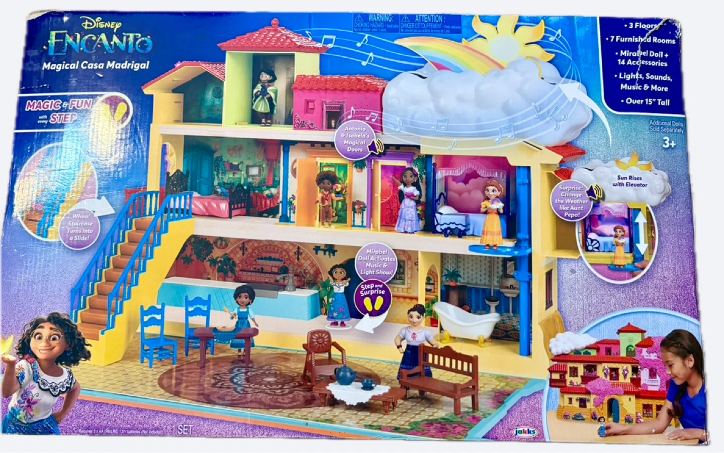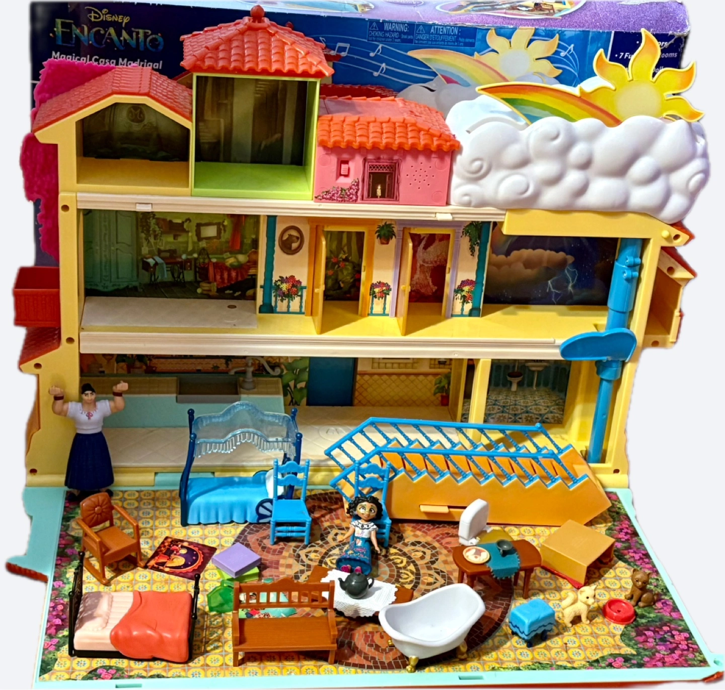 Playset includes multiple rooms, a balcony, and a working staircase. Features magical doors and a surprise light show. Comes with a few furniture pieces. Great condition.