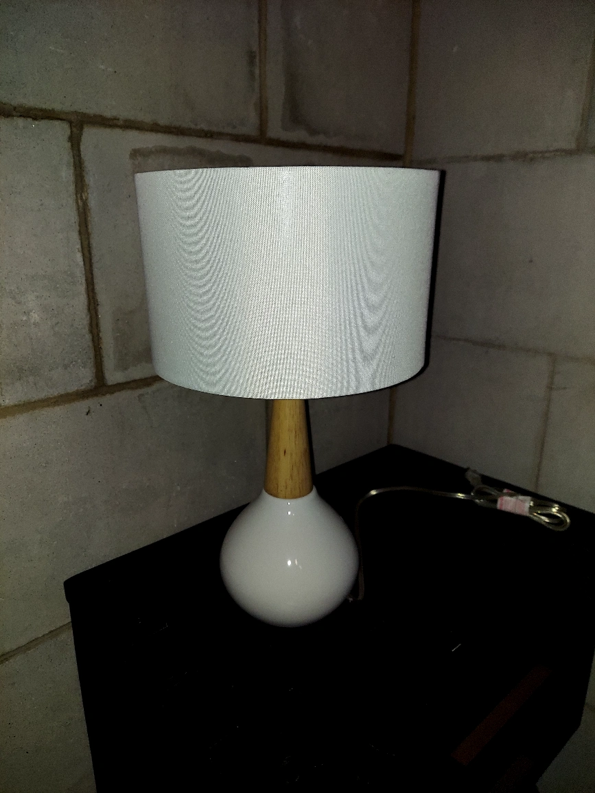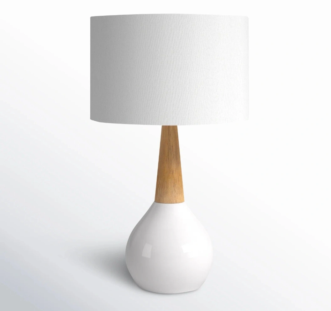 18White ceramic table lamp with a wood base and a white linen shade. The lamp is in good condition. It measures 18.5 inches tall and 11 inches in diameter.