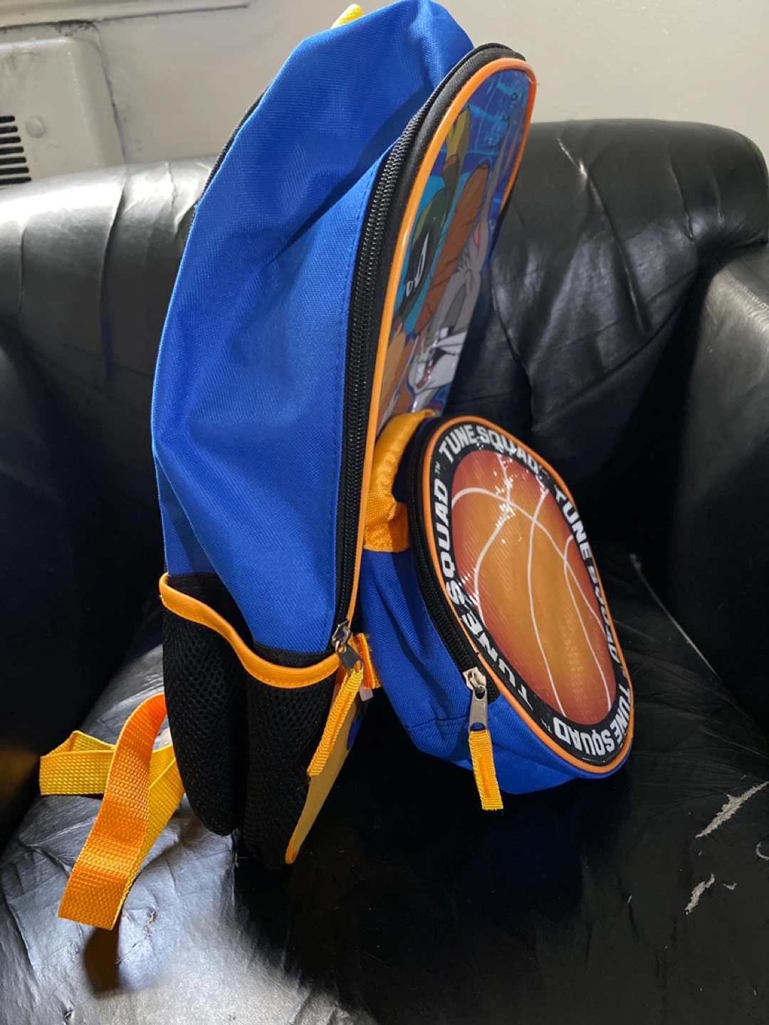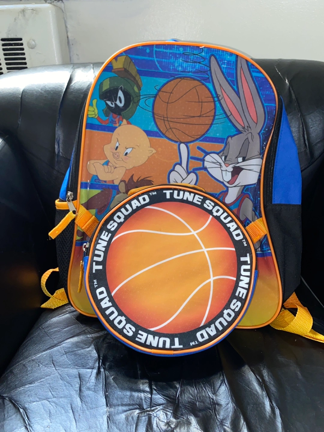 Blue and black backpack with yellow straps. Features a basketball and Looney Tunes characters. Includes a matching lunch bag.