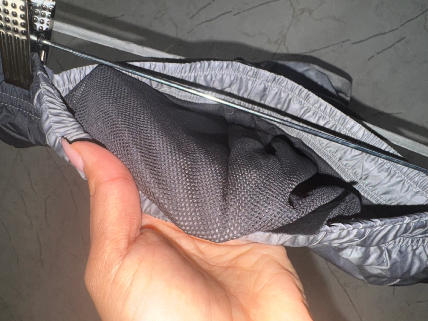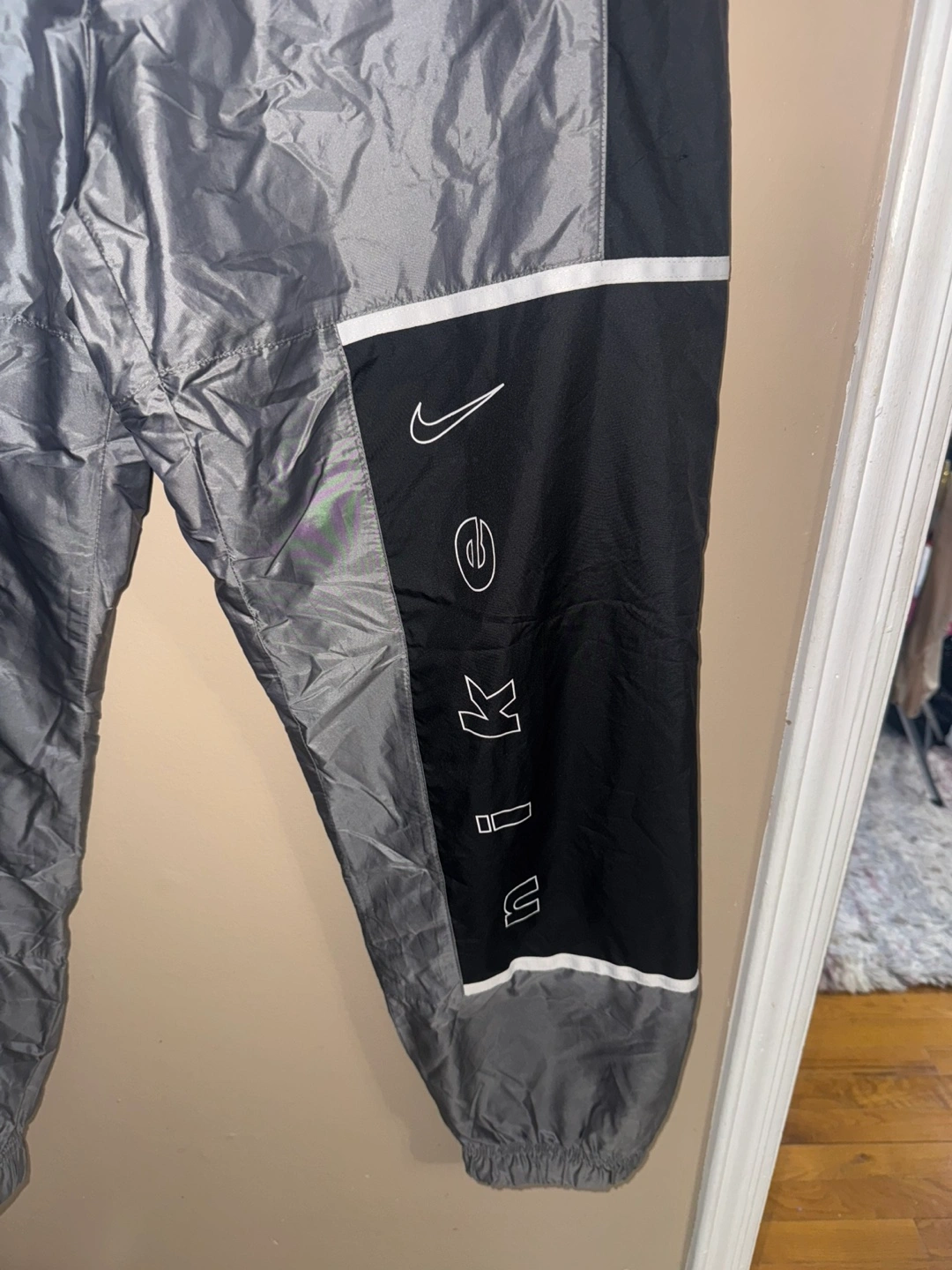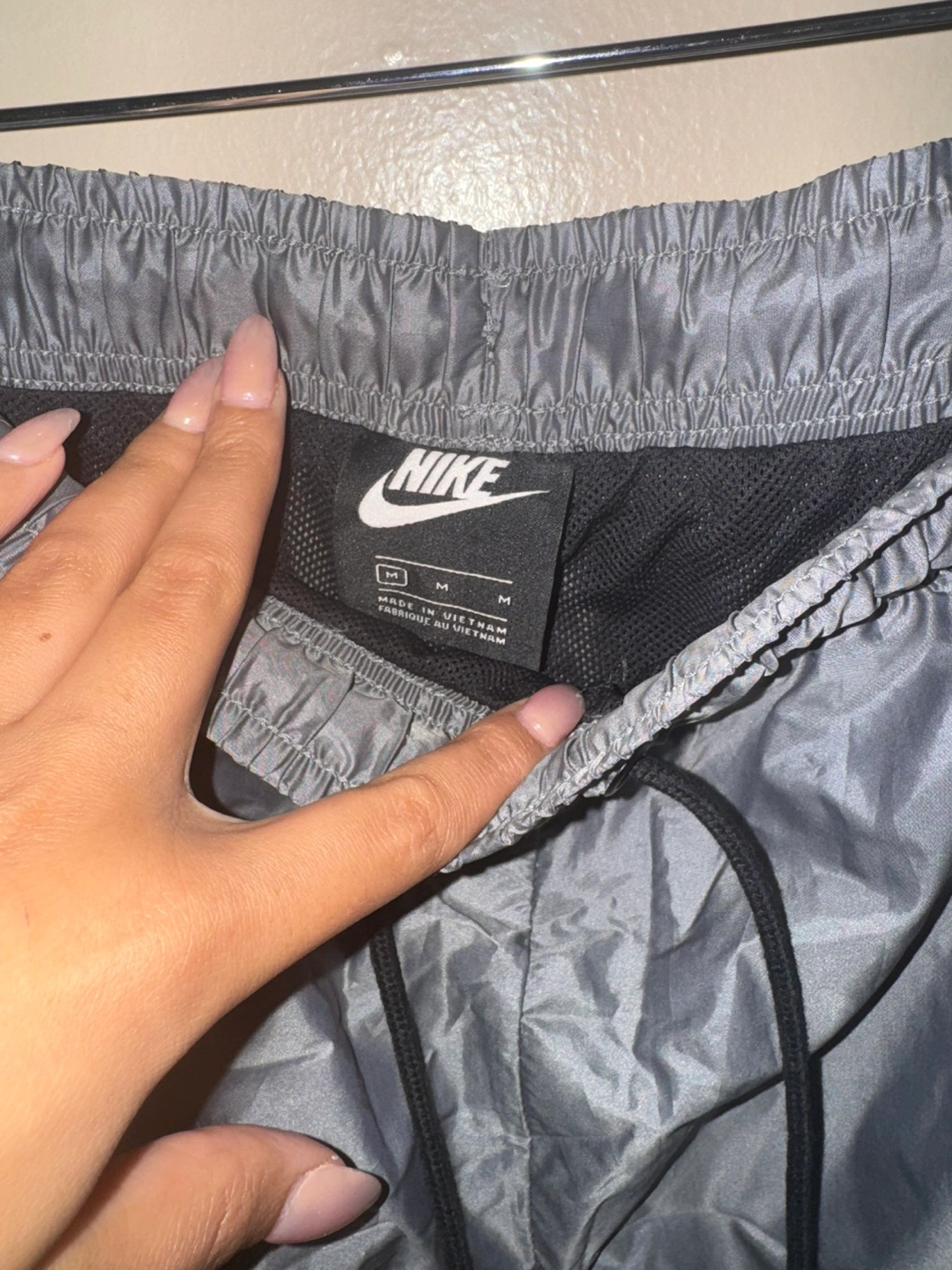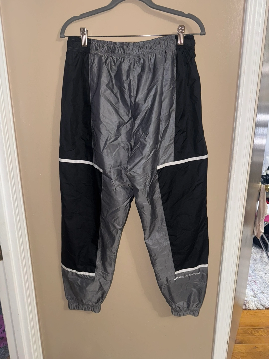 Grey and black lounge pants with white accents and a Nike swoosh logo. Made in Vietnam. Size Medium.