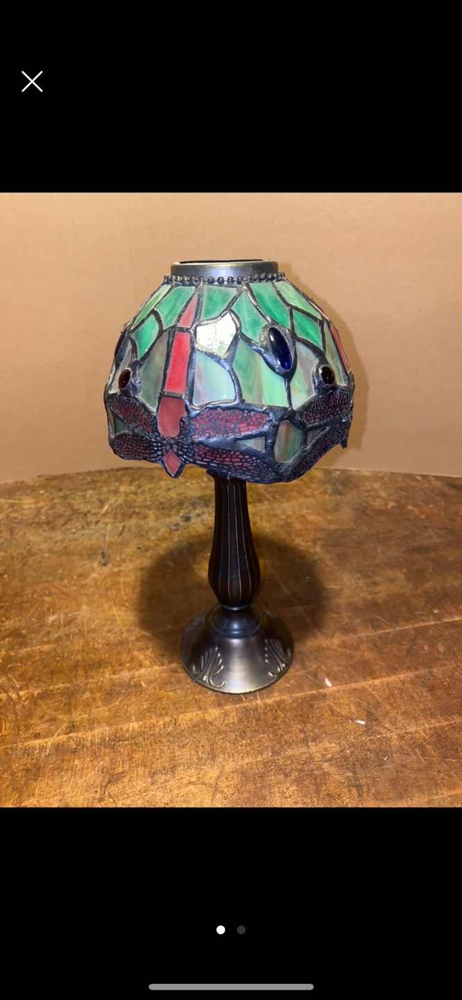 Stained glass candle holder with a dragonfly design. Holds a tea light candle.