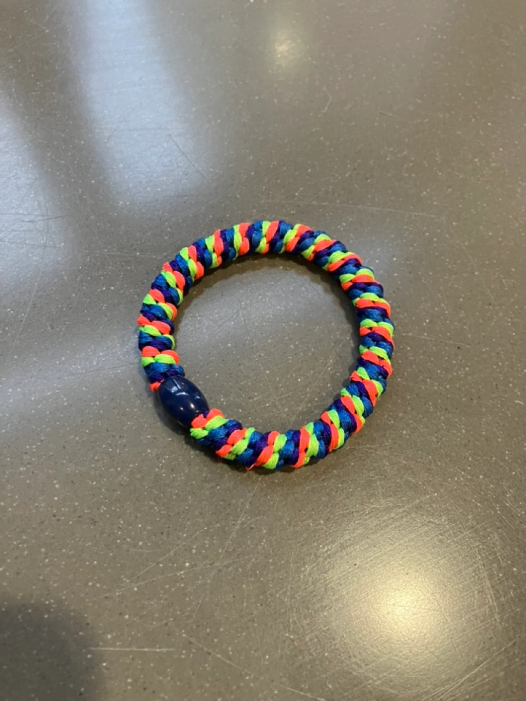 I donβt know what this is, if this is a scrunchie, or a bracelet, or what it is. It is soft material, it stretches, and it has a navy blue bead on it.