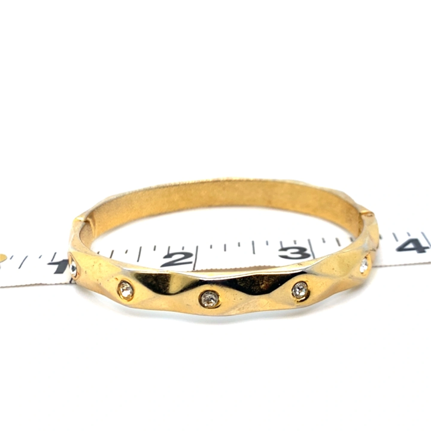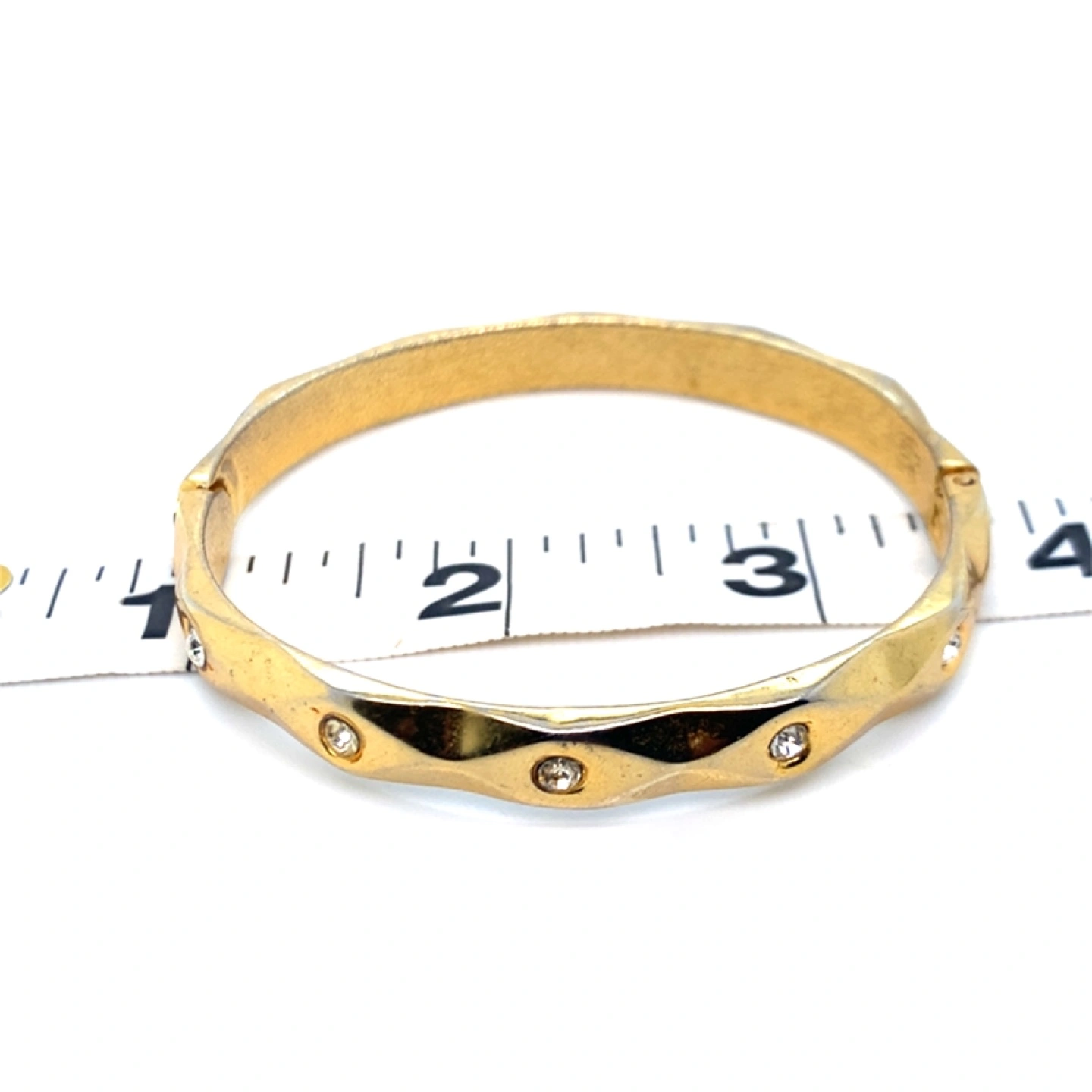 Gold tone hinged bangle bracelet with clear rhinestones. Measures approximately 2 inches in diameter.