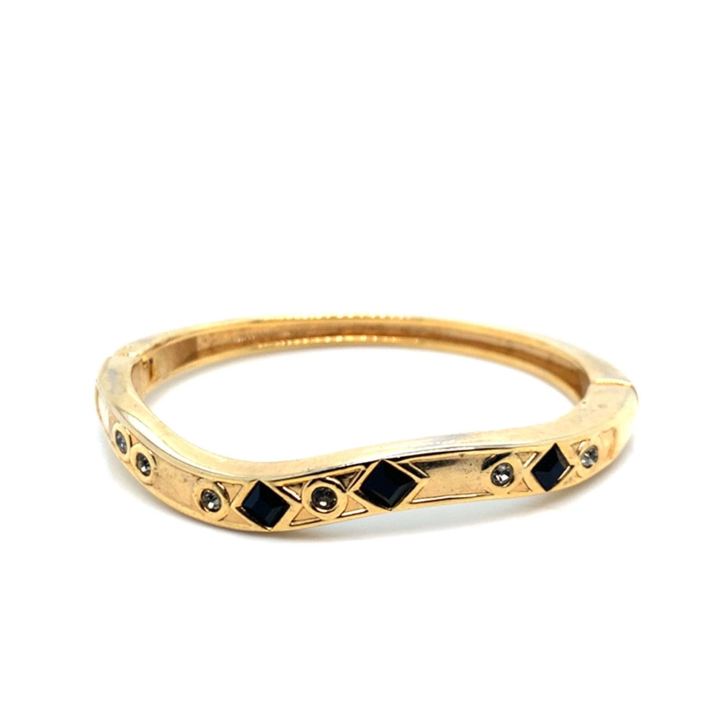 Gold tone bangle bracelet. Features a hinged closure and black and clear rhinestones.