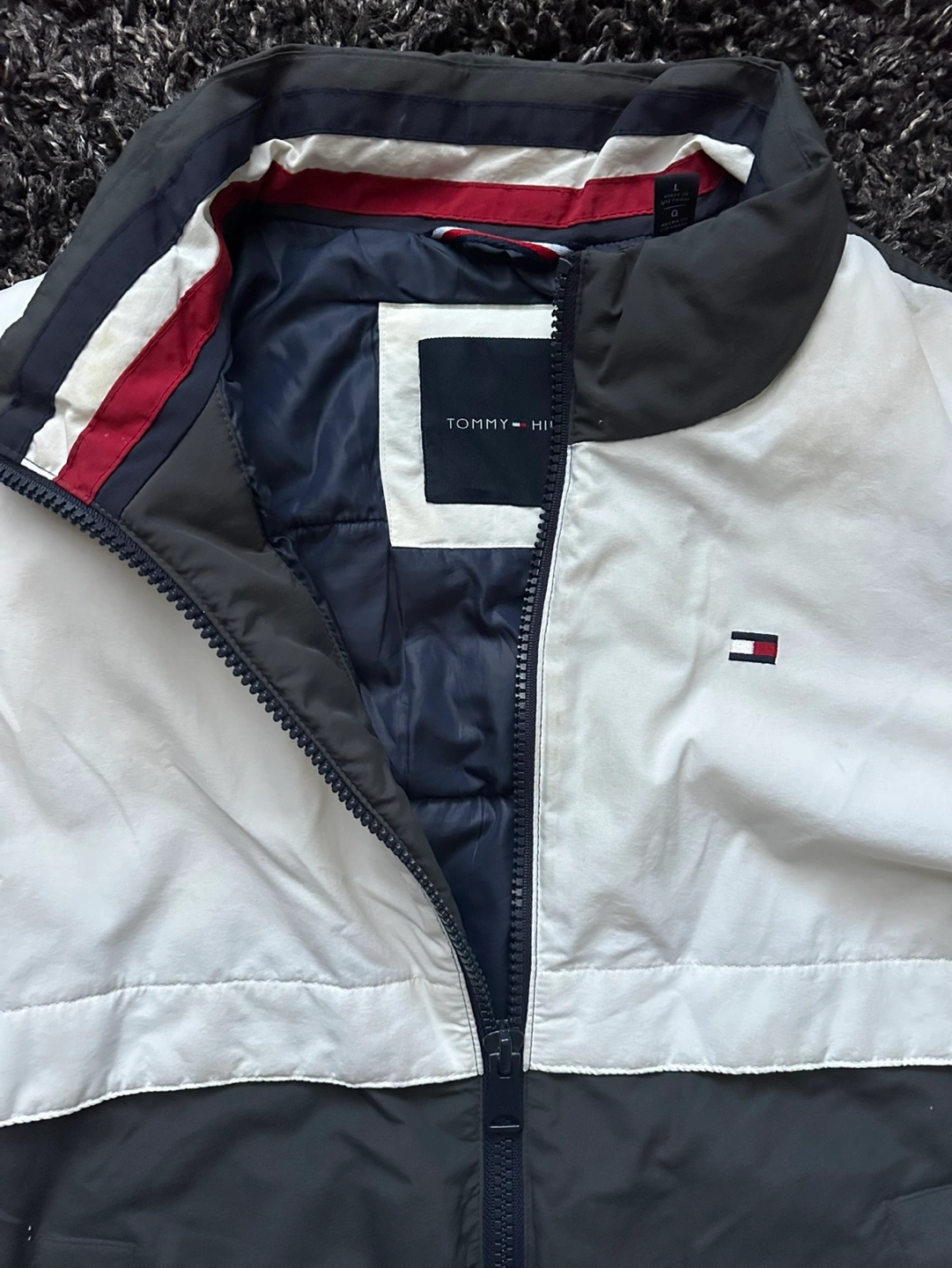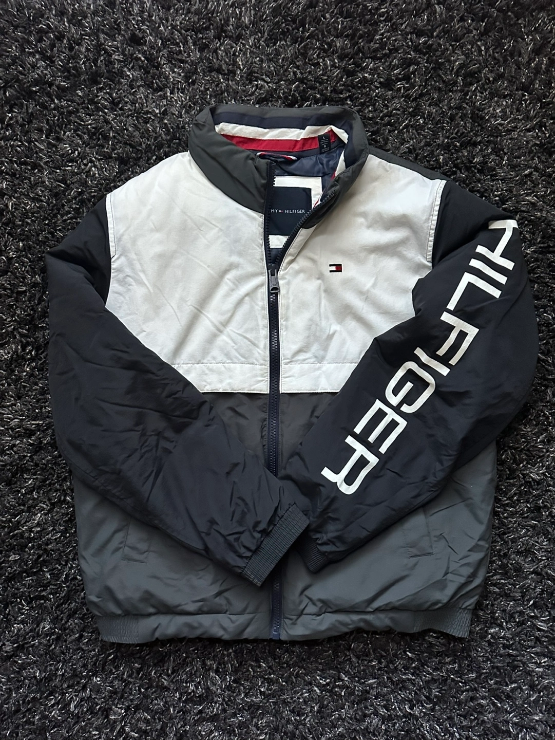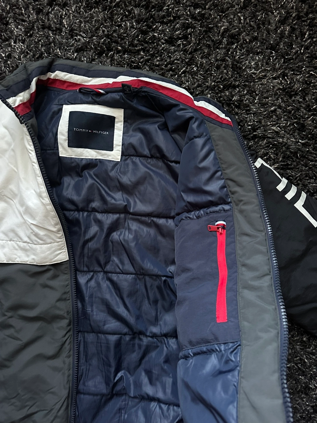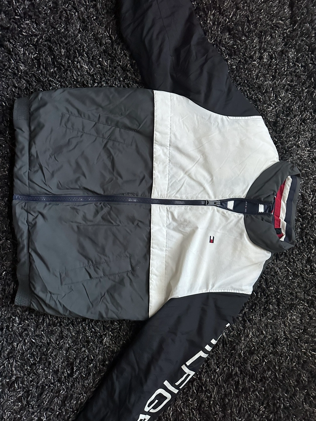 Men's winter jacket, grey, white and blue colour block design. Zip up front, two pockets. Tommy Hilfiger branding on sleeve and tag. It’s been used for one winter, but it’s in good condition. Dm if interested.