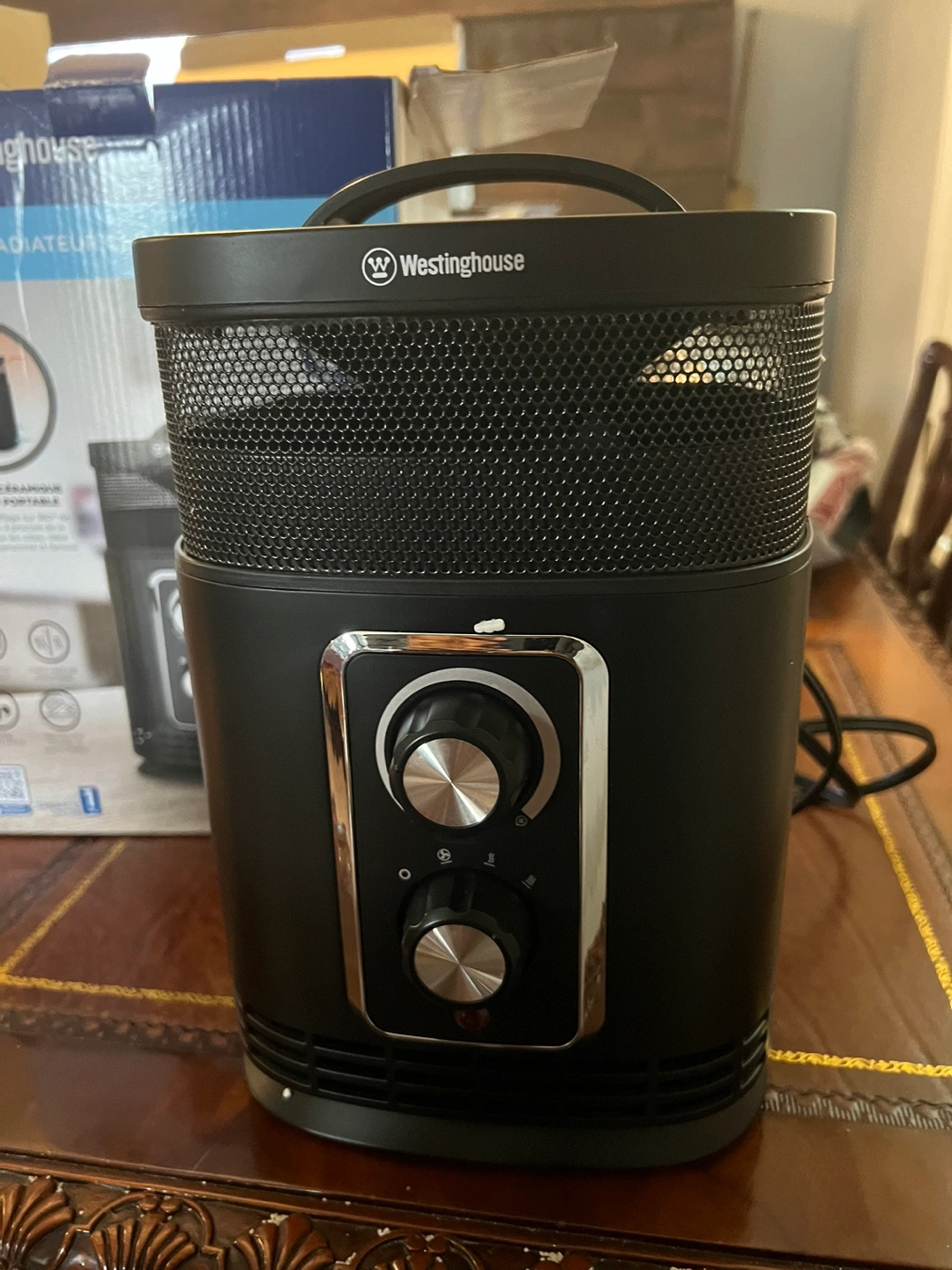Ceramic heater with 360° heat distribution. Includes adjustable thermostat, 2 power settings, and a fan-only option. Features an anti-tip safety switch and a built-in handle for easy transport.