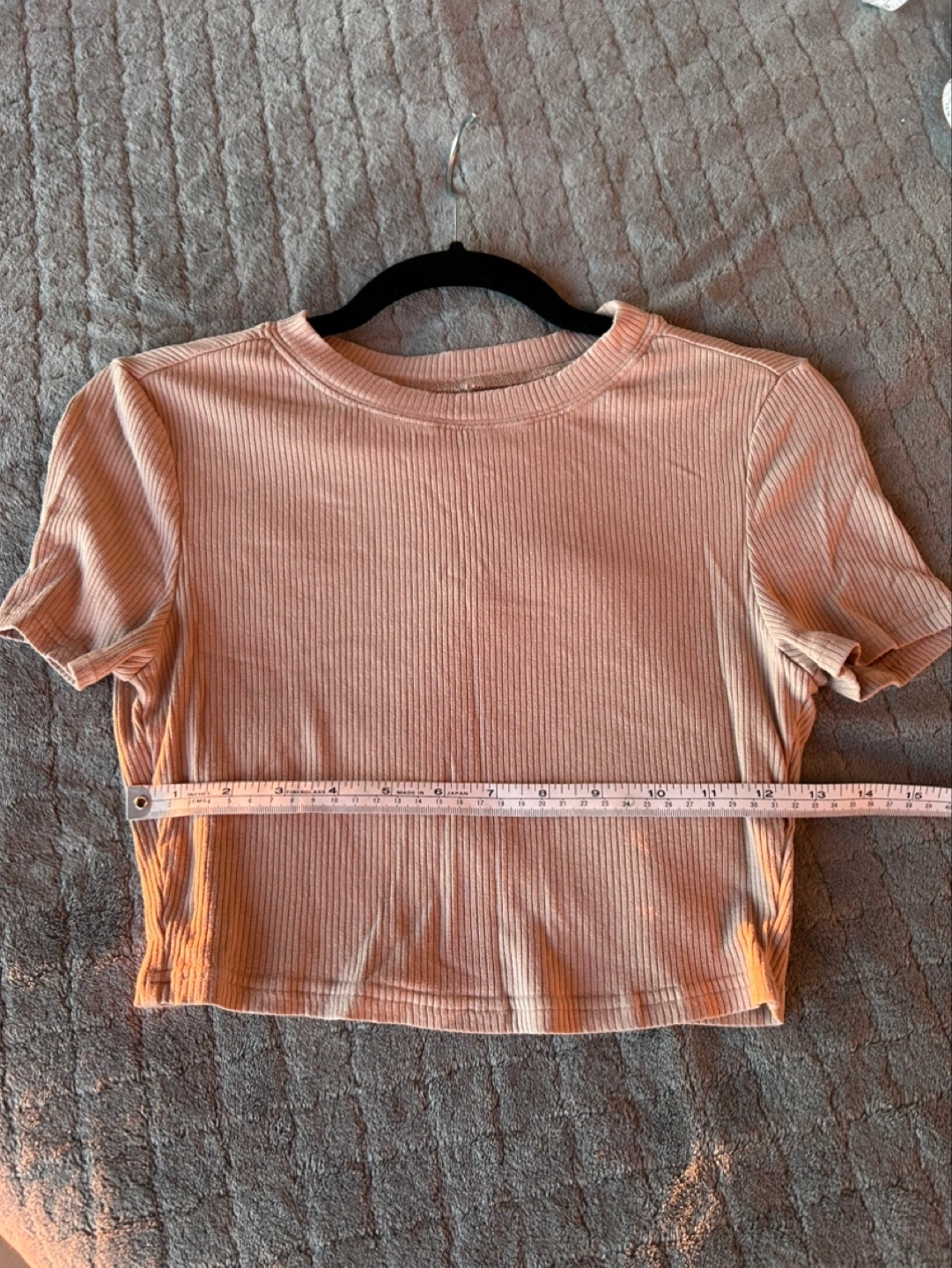 Short-sleeved, cropped, ribbed top in cream-tan color. Pickup or meetup in area near LaSalle St Station. Check out my other items (lots of FREE with purchase!)