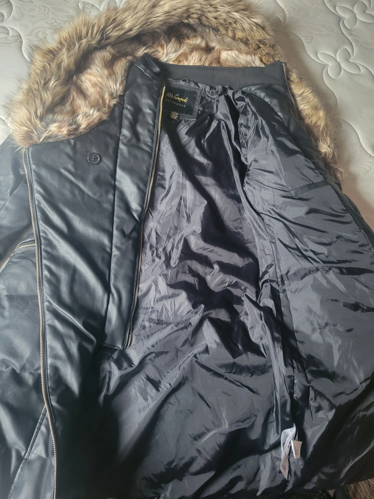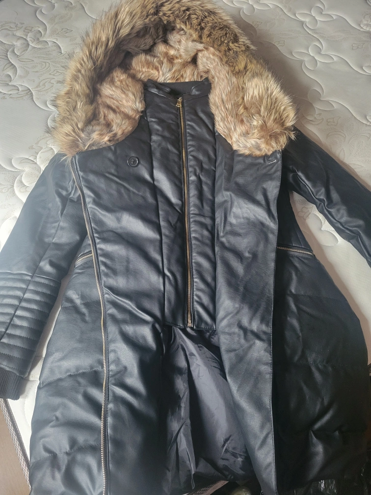 Stay toasty in this faux leather winter coat with fur-lined hood. Features a zip-up front closure, zippered pockets, and a cinched waist. Wind and water resistant. Down filled.