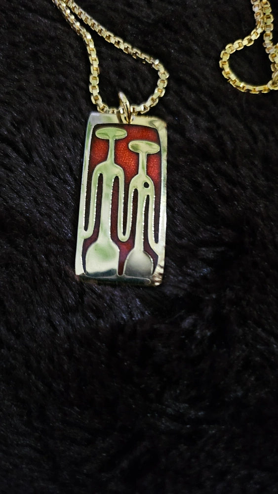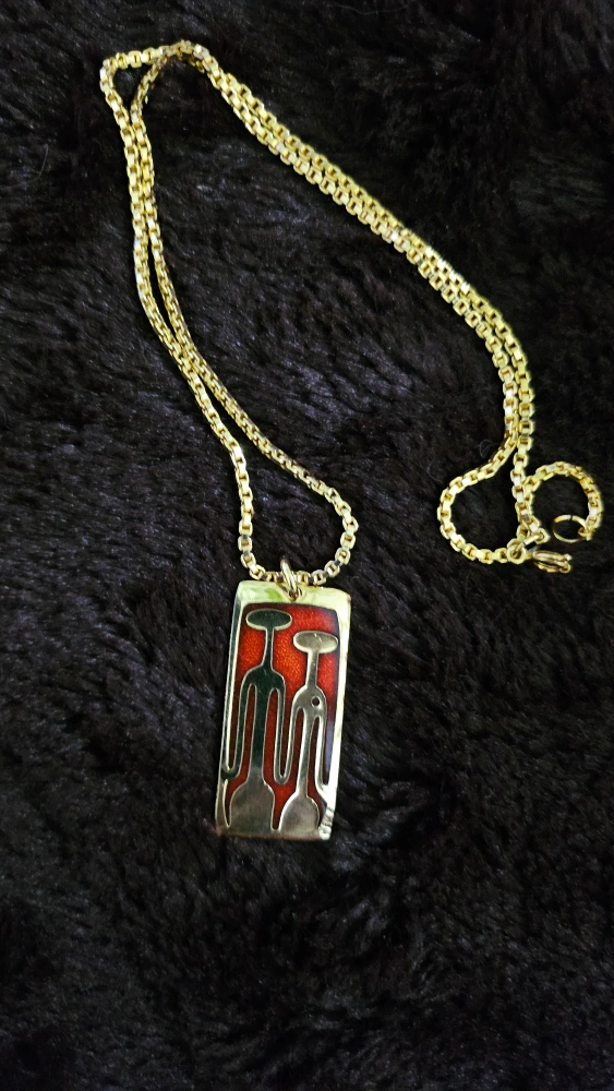 Gold-toned chain necklace with red enamel pendant. The pendant is rectangular and features an abstract design of a couple holding hands.