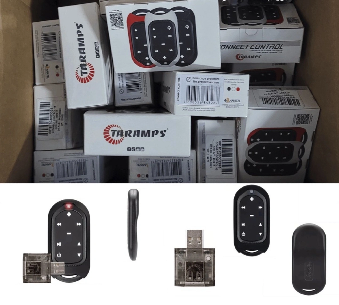 10Remote control for car audio. Includes USB receiver. No protective case. Includes a few buttons with arrows and other symbols.