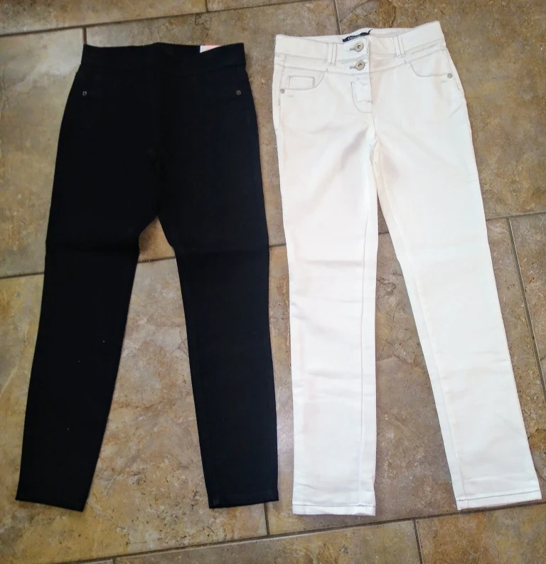 342Two brand new pairs of girl's jeans both size 12. From a smoke and pet free home. 1. Girl's Size 12 Black Jeggings with store tags still attached from Justice. $15 2. Girl's Size 12 White denim jeans. Brand name George. $10