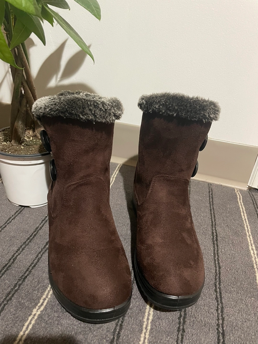Brown suede boots with faux fur trim. Two button closures.