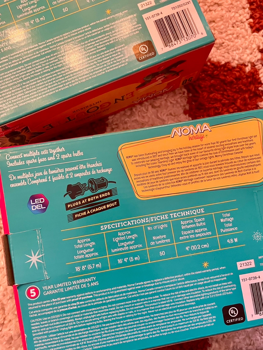 Selling TWO packages of Noma Heritage LED Christmas lights, multi-coloured teardrop design. Only used one season, both strands are in perfect working condition. Price is for both packages. Cash only. Pickup at or near High Park TTC station. If you have any questions, just send a message :)