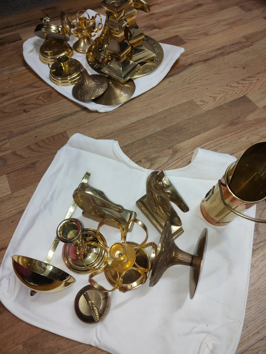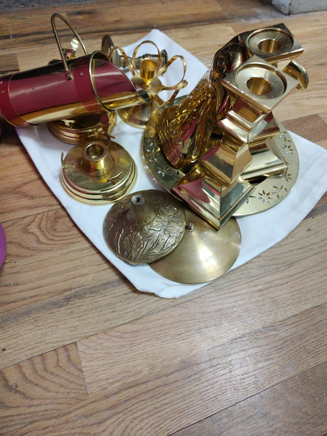 This lot includes a collection of decorative brass items like candle holders and ornate pieces. Also included is a large brass-colored dustbin. These items are all brass or brass-plated. They'd work well for home decor or as part of a collection!