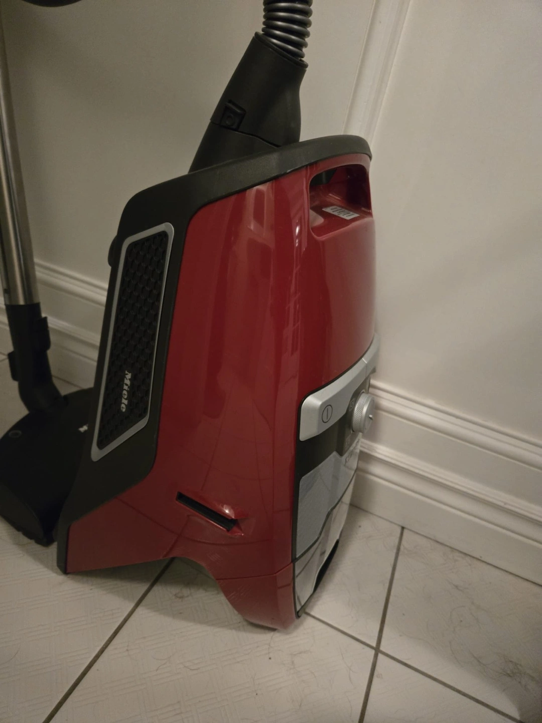 Red vacuum with a telescopic wand, hose and attachments. Includes a parquet twister floorhead. Was only used 4 times and is practically brand new.