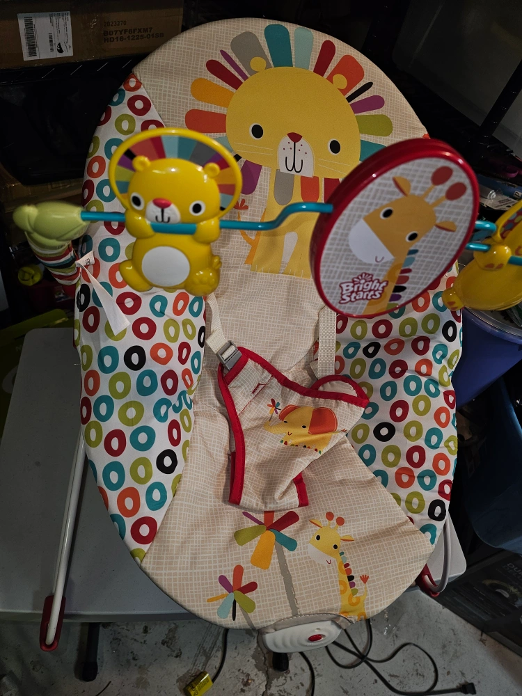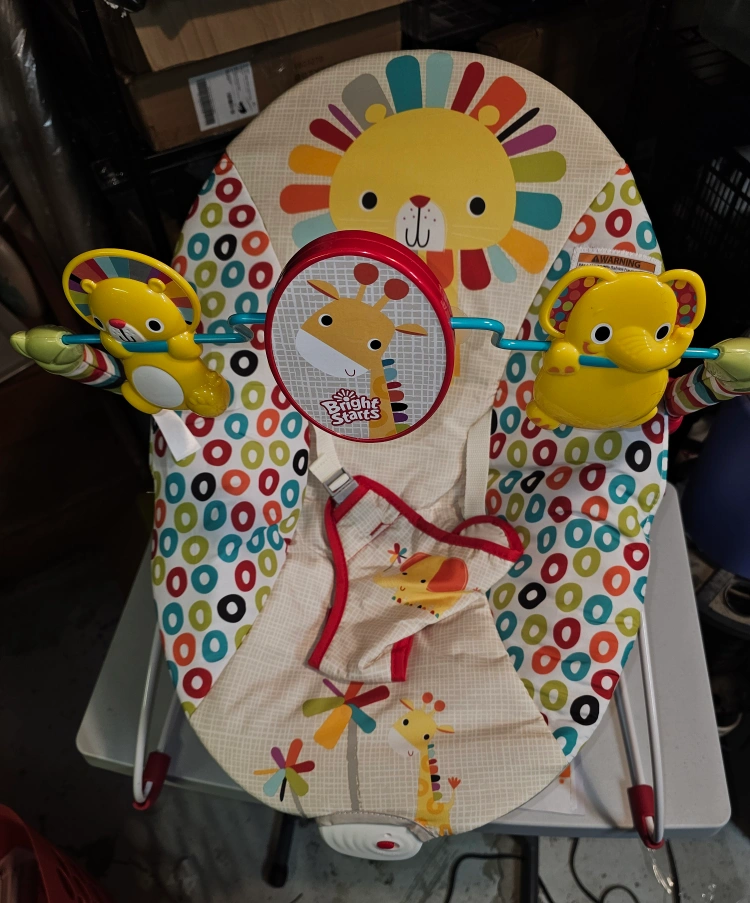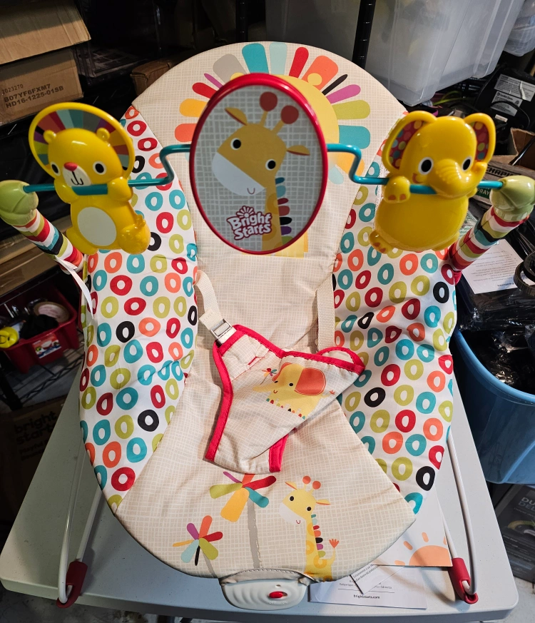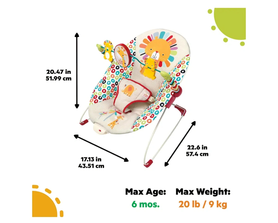 Baby bouncer with colourful animal toys. Suitable for infants up to 20 pounds.