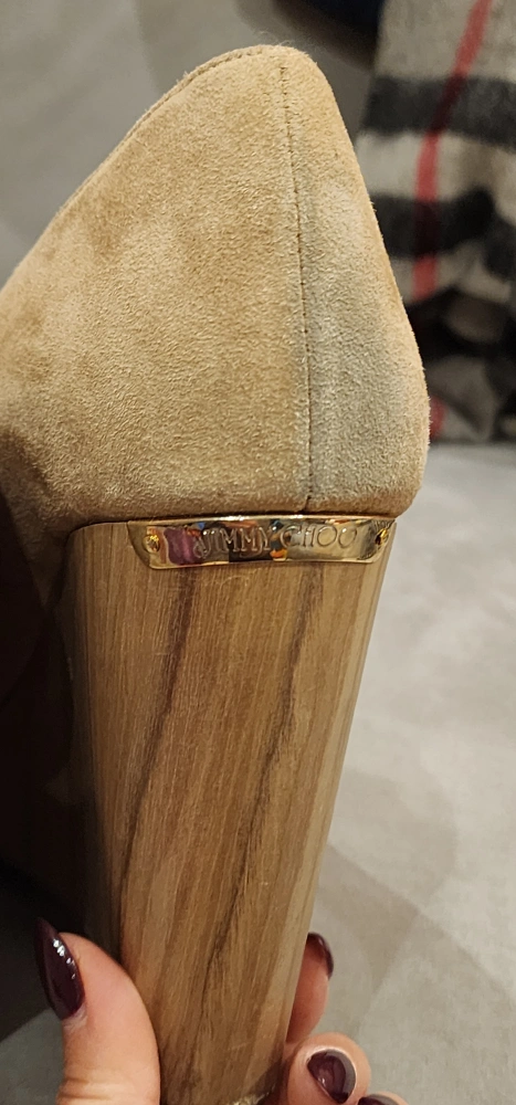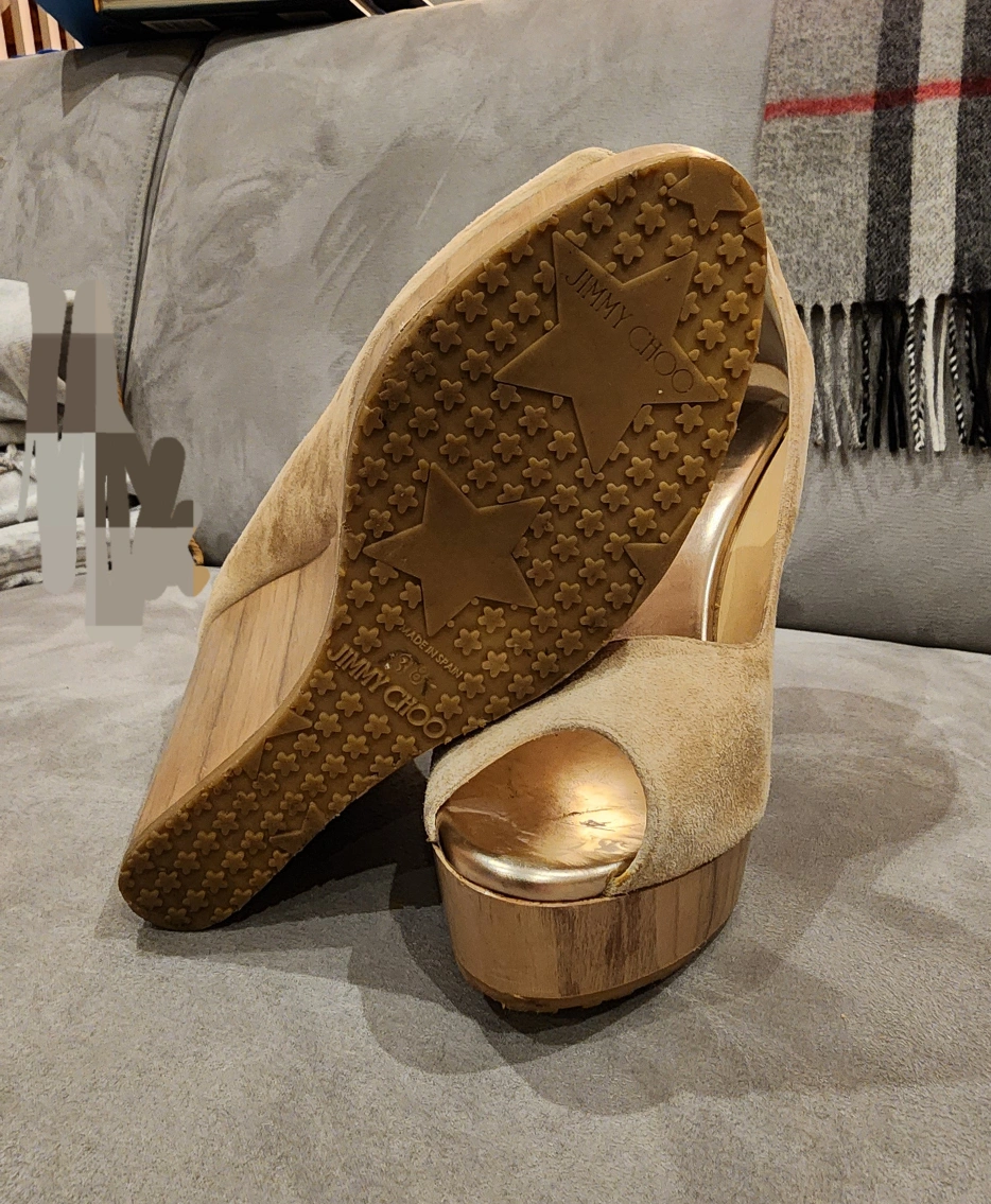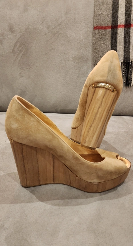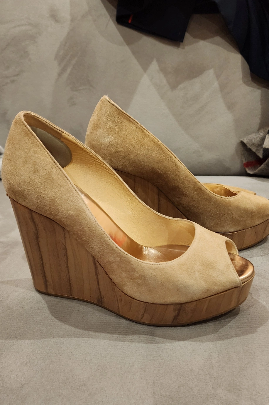 These stunning wedges are crafted of tan suede leather with wooden platform and gold accents. Peep toe style. 120mm wedge