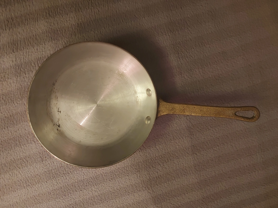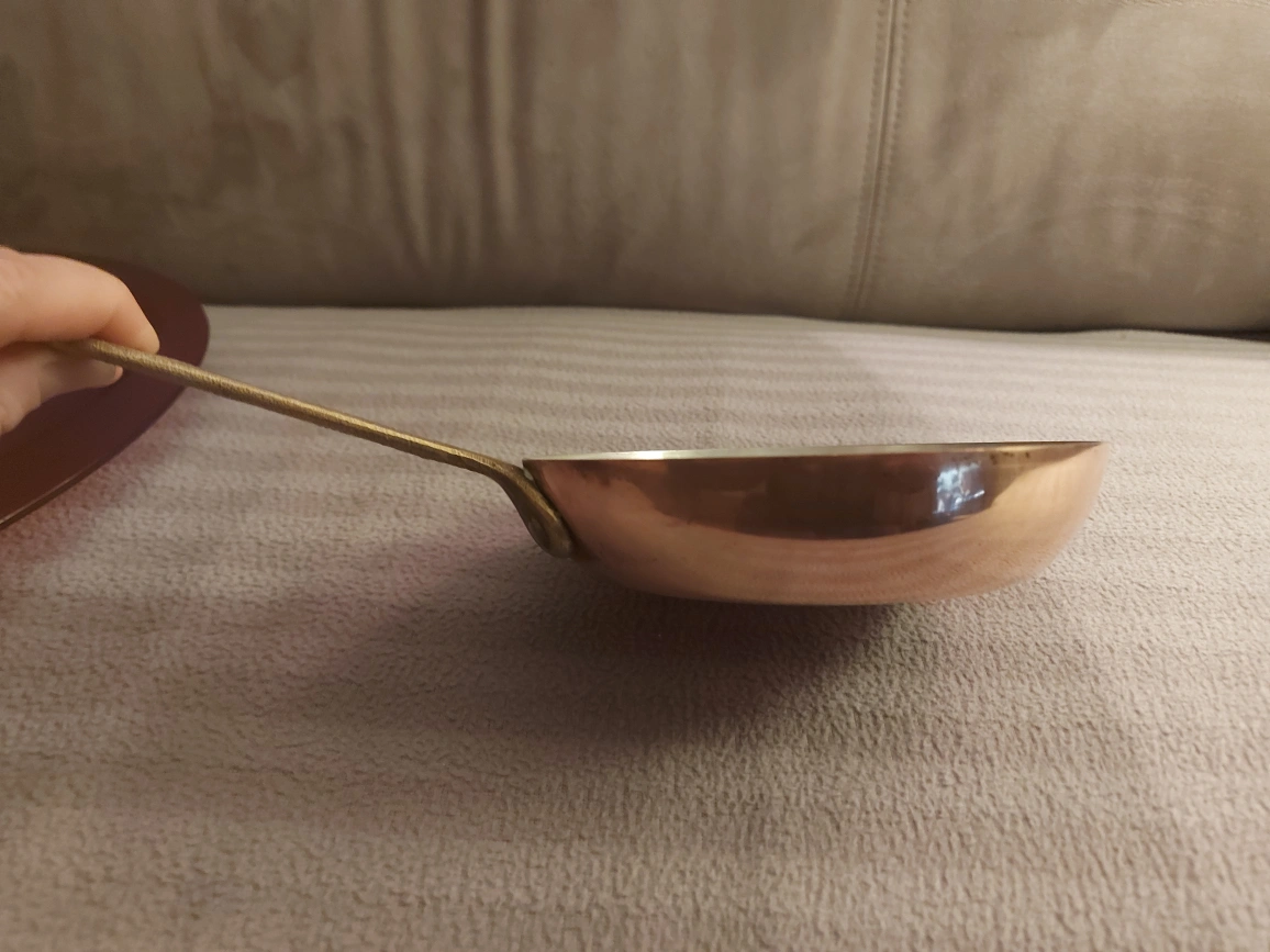 Small copper saucepan with a brass handle. Measures 5.5 inches across. Some marks. pls see the pics.