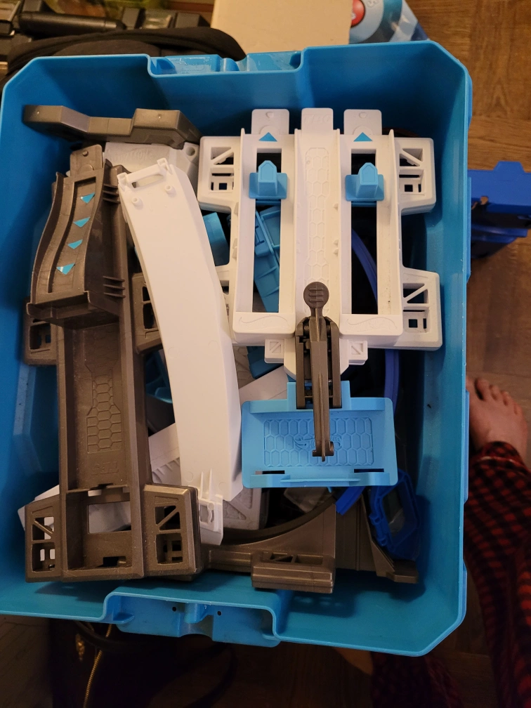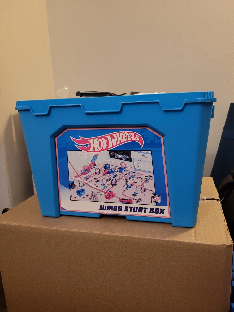 Blue storage container with Hot Wheels logo and tracks and pieces inside. No missing pieces; it's just as it was when I bought it.