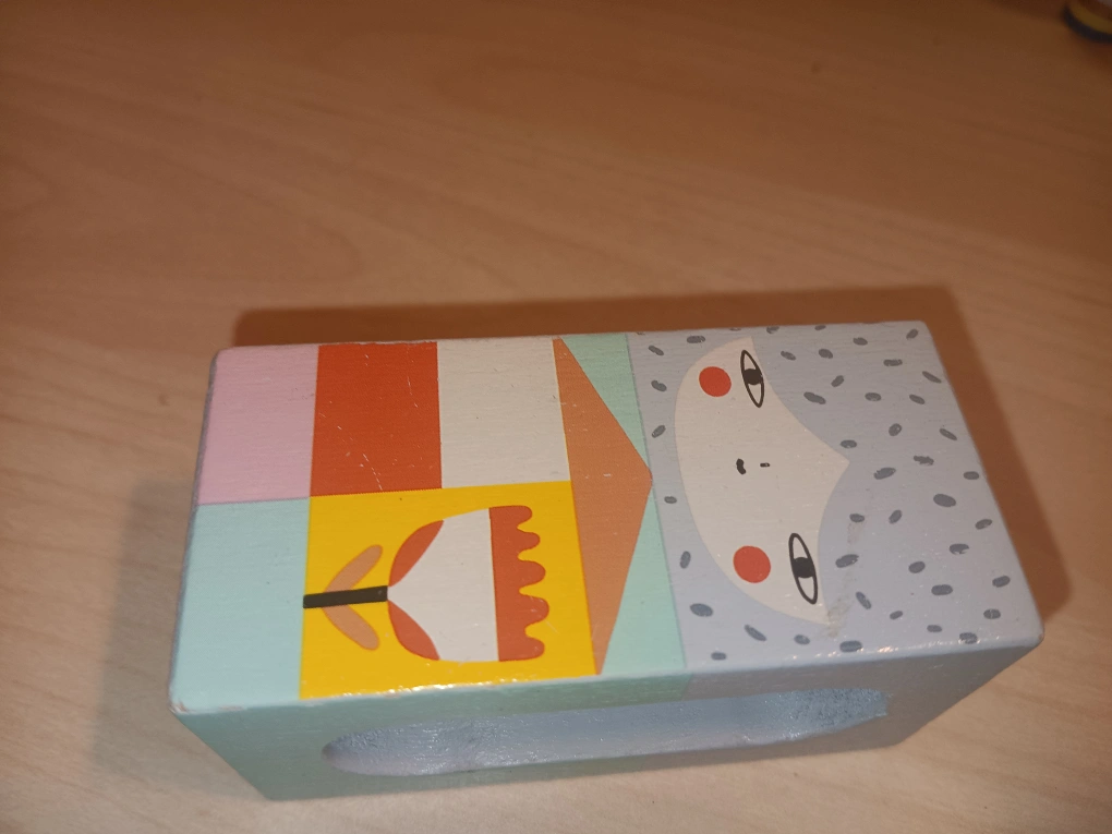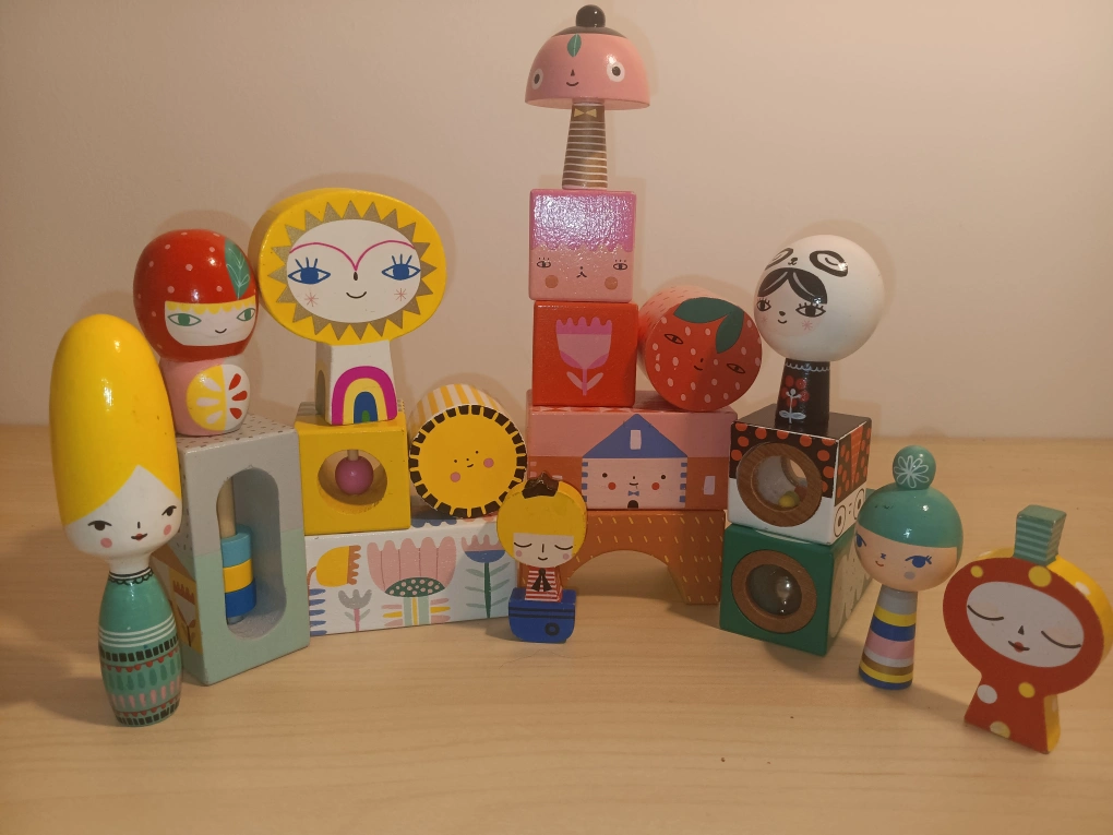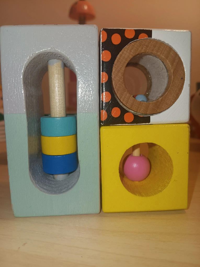 Each hardwood block contains rattle and moving parts that develop fine motor skills. Lively hand painted faces and vivid colors offer visual stimulation.