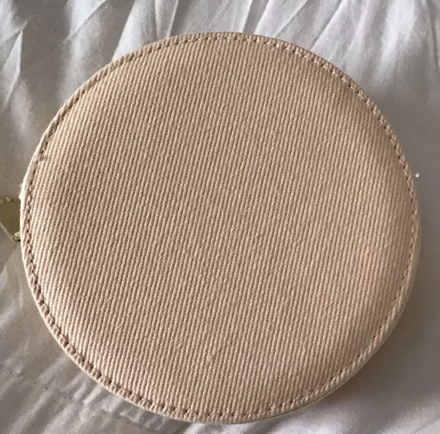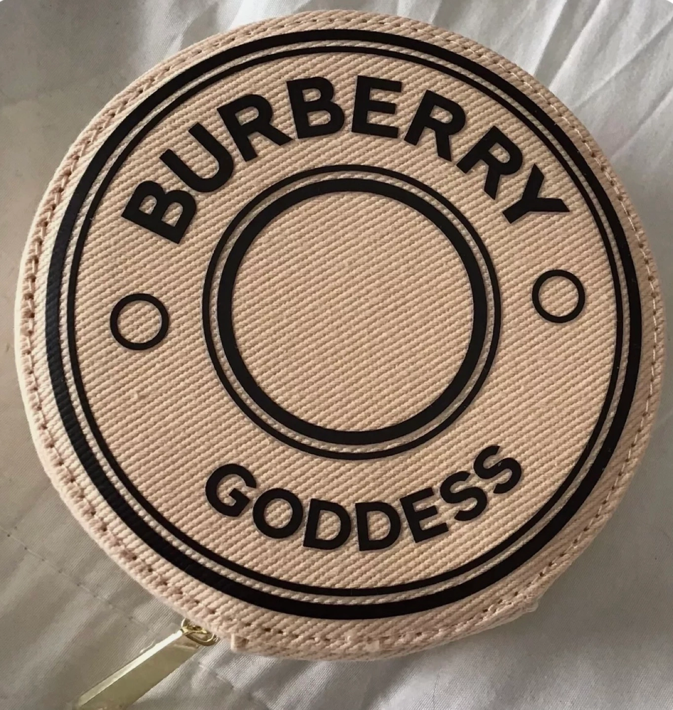 Round sling bed with zipper closure. Features a Burberry logo and comes with an attachable strap.