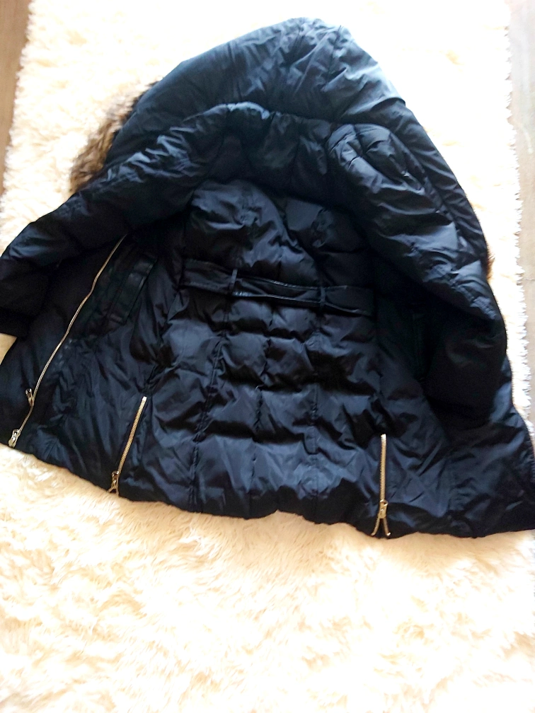 NEVER WORN! Black puffer jacket with a faux fur hood and a belt. Gold coloured zippers. says XS but can fit up to Size medium. very large jacket. has double zipper extremely warm! selling because I drive mostly. no need for heavy jacket.