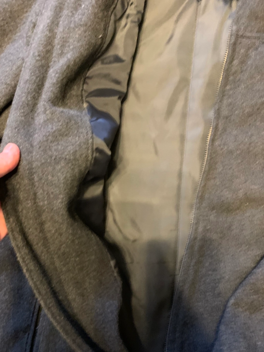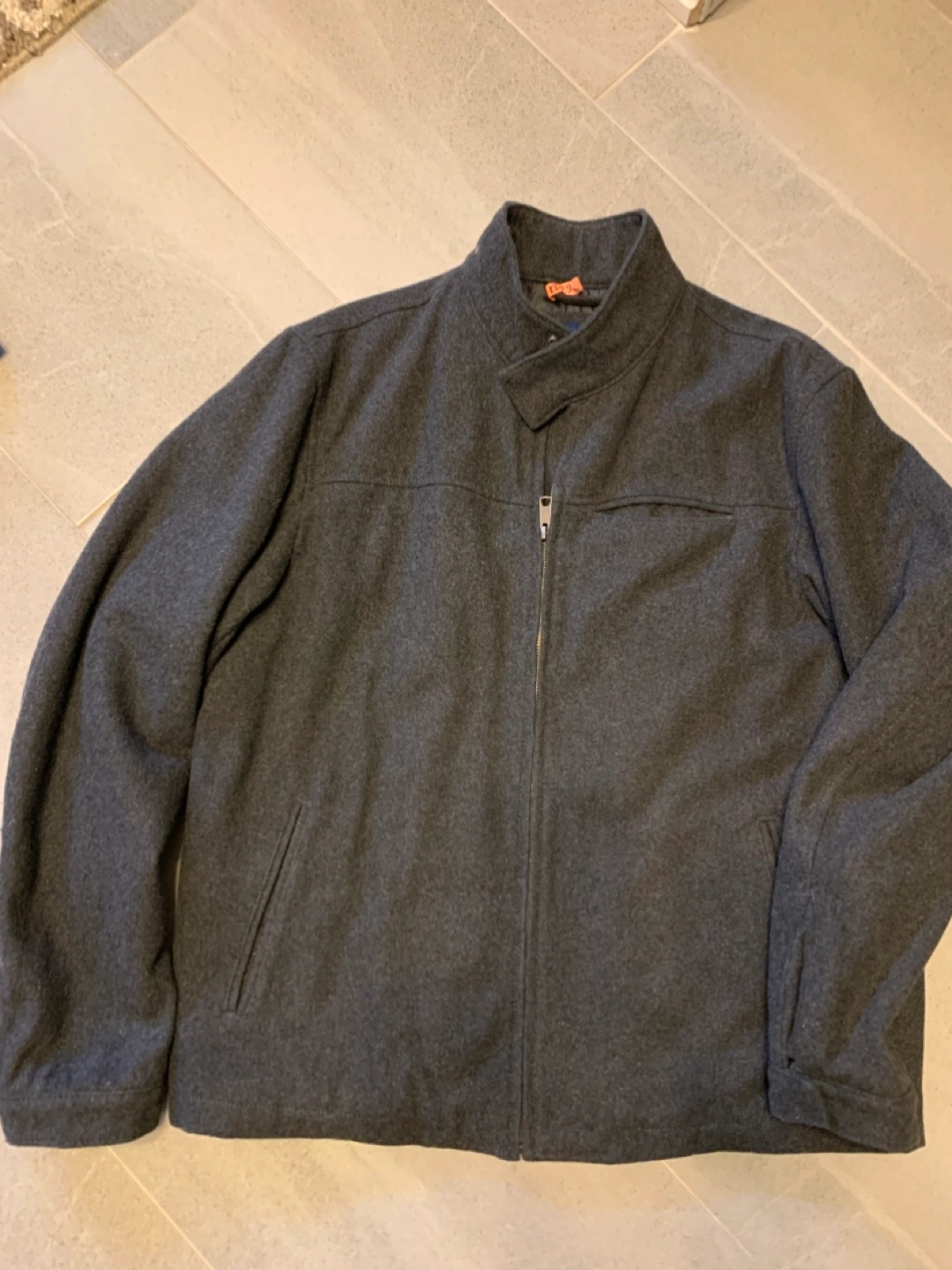 Men's grey jacket with a zipper closure. Has a small pocket on the left side of the chest. The jacket has a smooth lining.