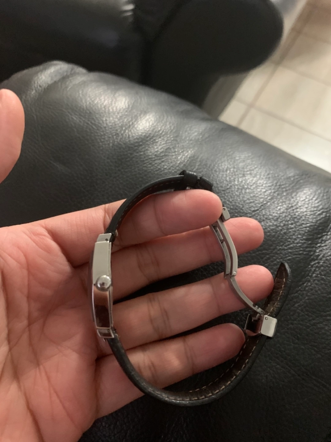 Black face with diamond accents. Black leather strap. Stainless steel casing with lifetime free battery replacement at Rodeo jewellers
