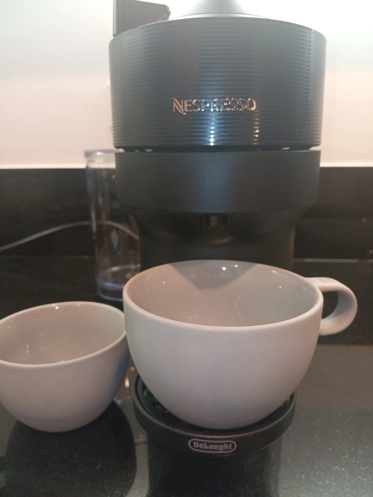 Nespresso Essenza Mini coffee machine. Includes two grey cups, a cup warmer, and a capsule container. Gently used. Machine automatically collects used pods in a side pocket. Free pods included 3 different flavors.