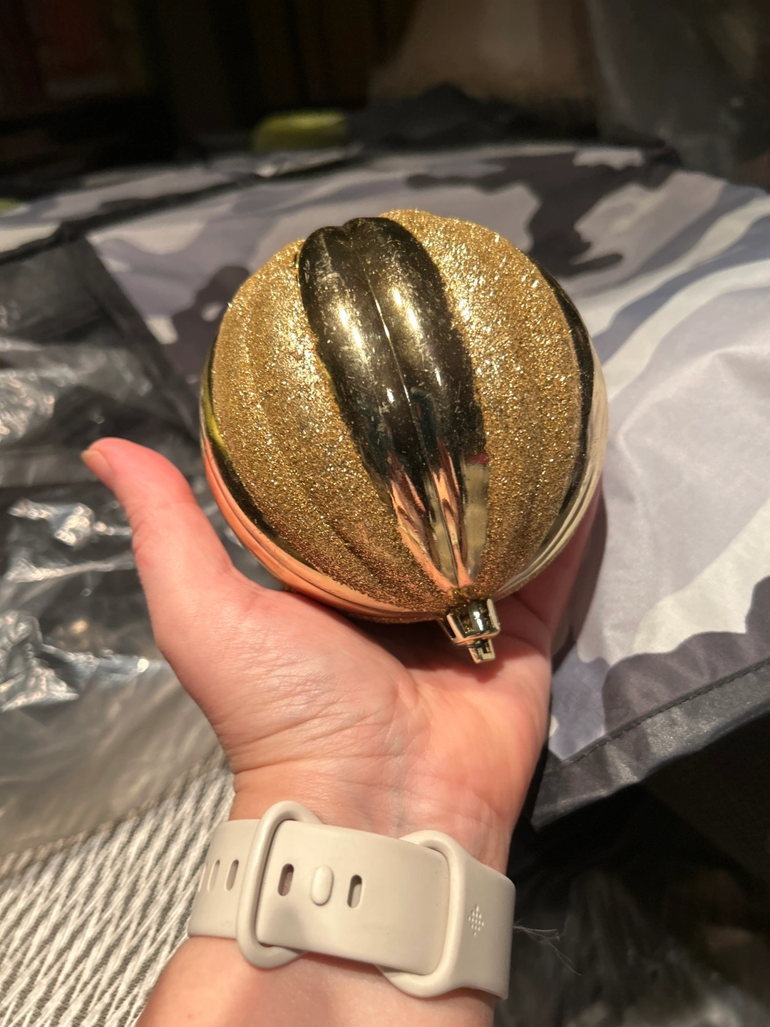 Gold glitter Christmas ornament. Large, round, with a metallic gold finish.