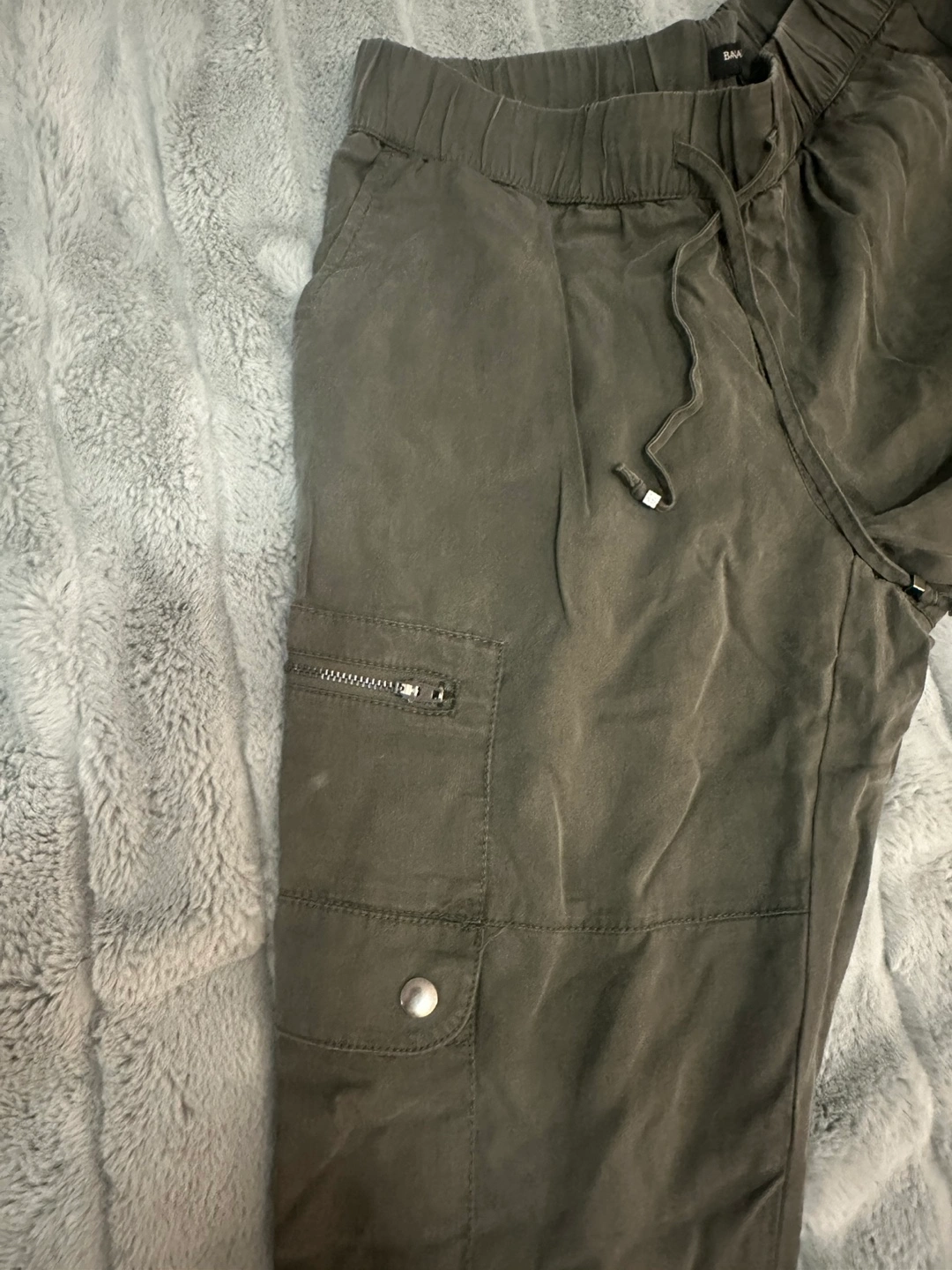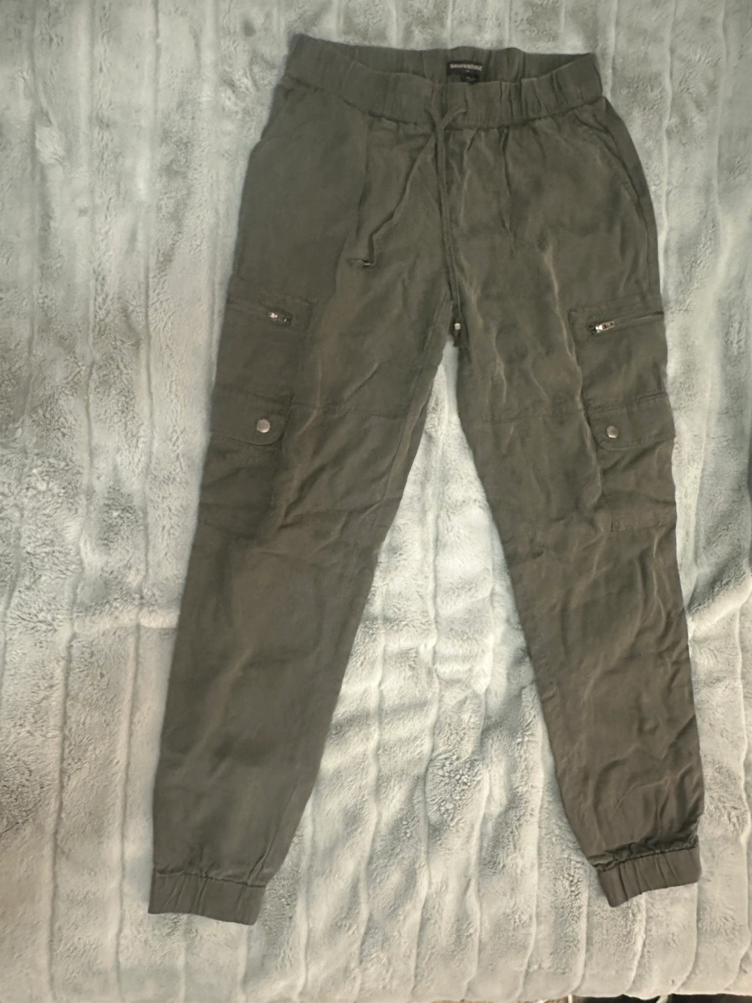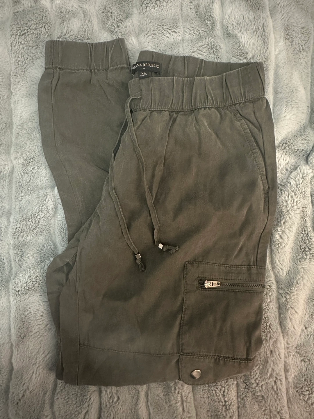 Gently used, Banana Republic Jogger-Style Cargo Pants, zipper & button side pockets in dark green/gray color