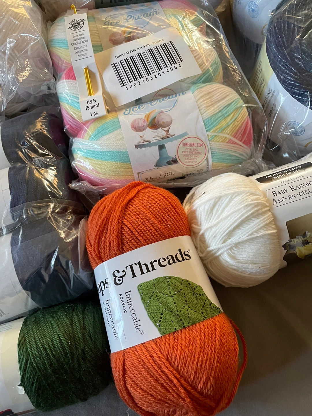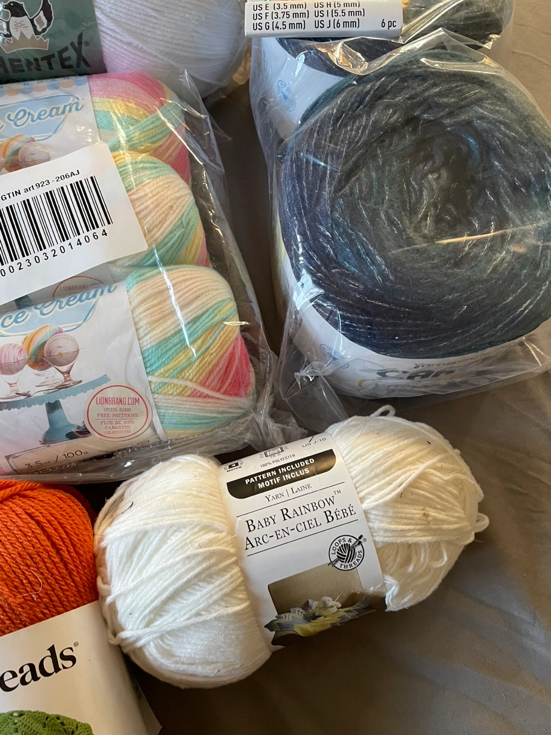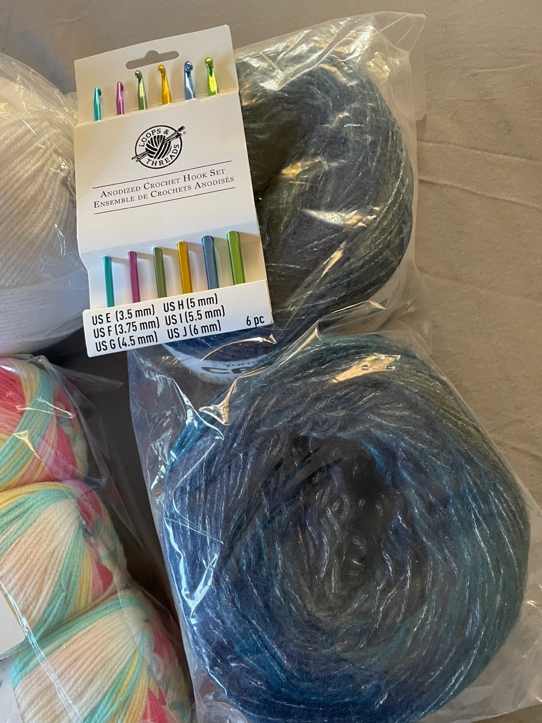 Yarn in various colors and sizes, including white, light beige, orange, blue, green, and multicolored. 14 skeins.Includes a set of crochet hooks and a single crochet hook.