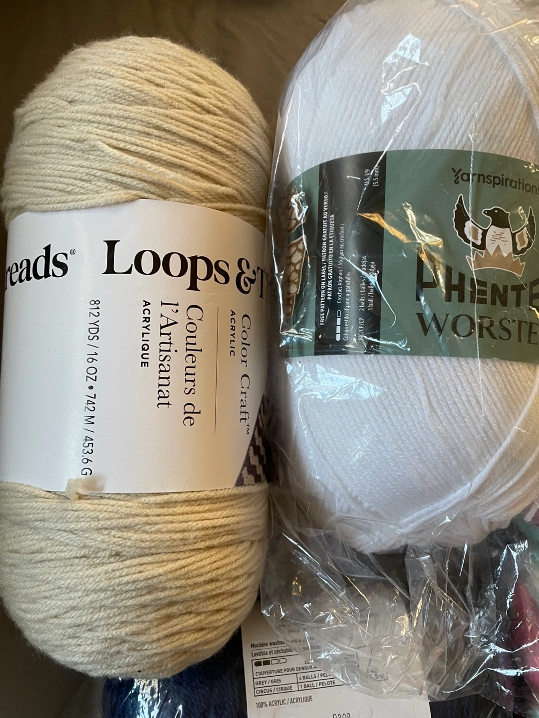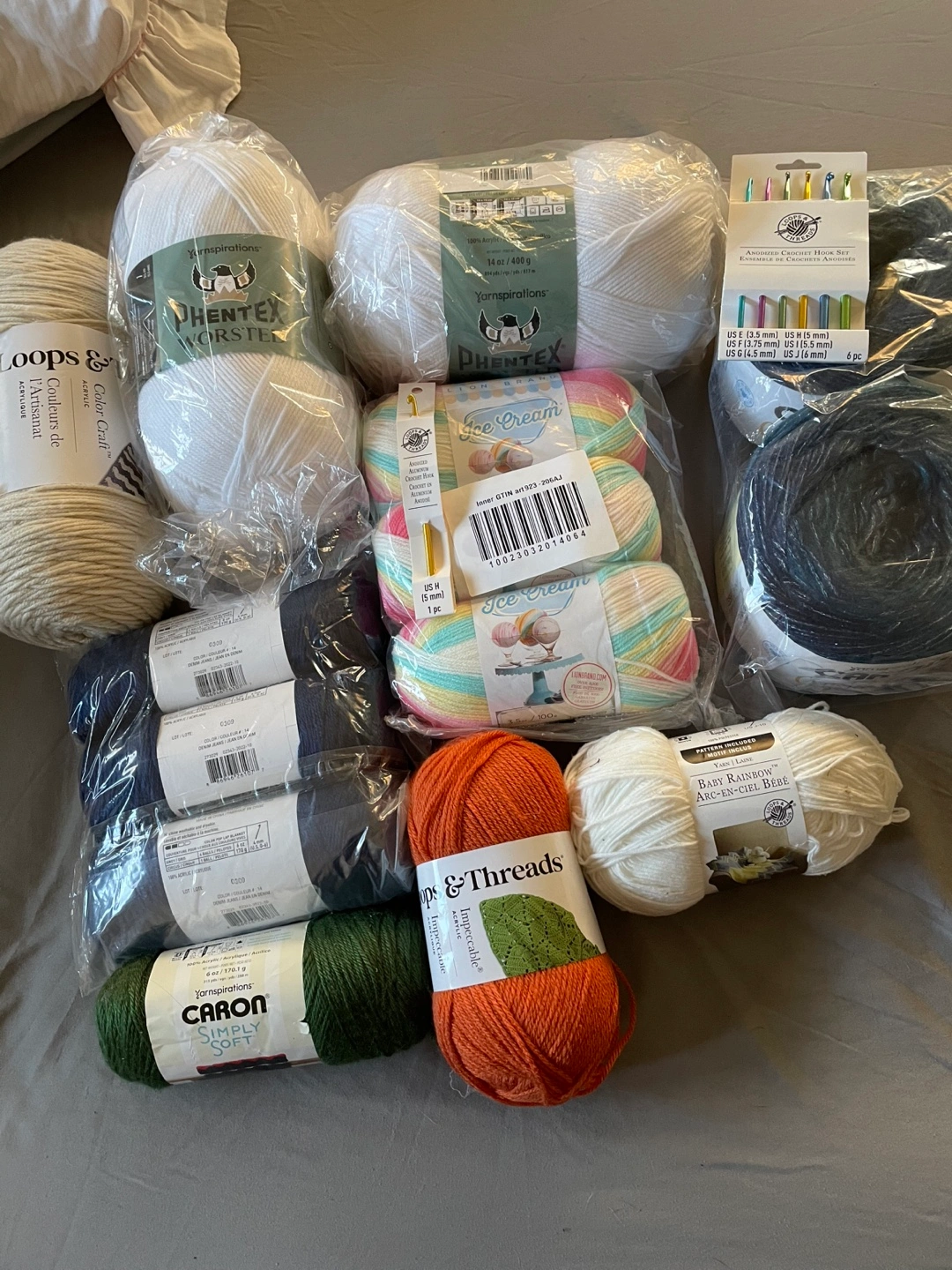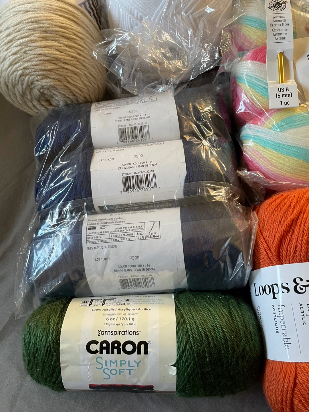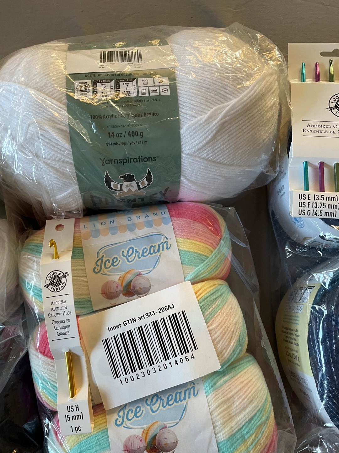 Yarn in various colors and sizes, including white, light beige, orange, blue, green, and multicolored. 14 skeins.Includes a set of crochet hooks and a single crochet hook.