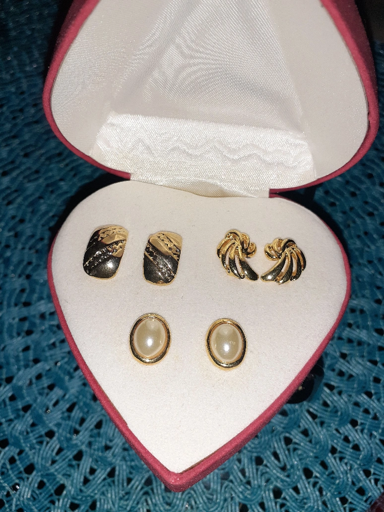 3 pairs of stylish gold tone earrings in a beautiful red heart shape box. Perfect as a gift. Brand New...Never worn. Reuse recycle pet and smoke free home.