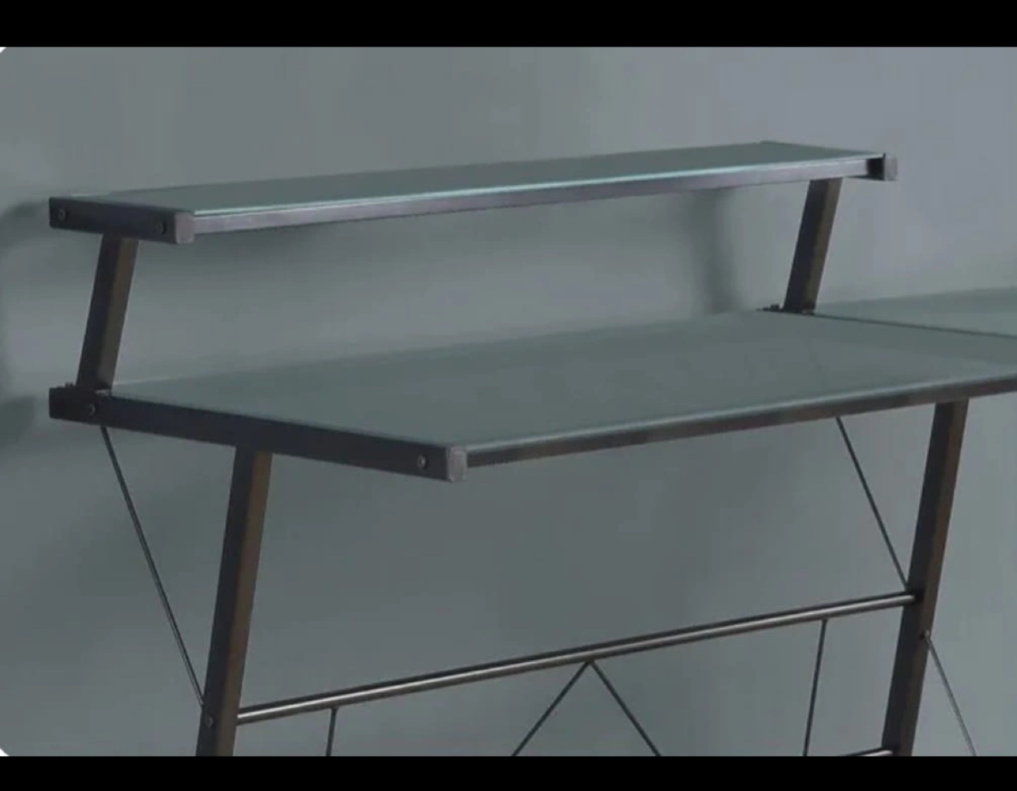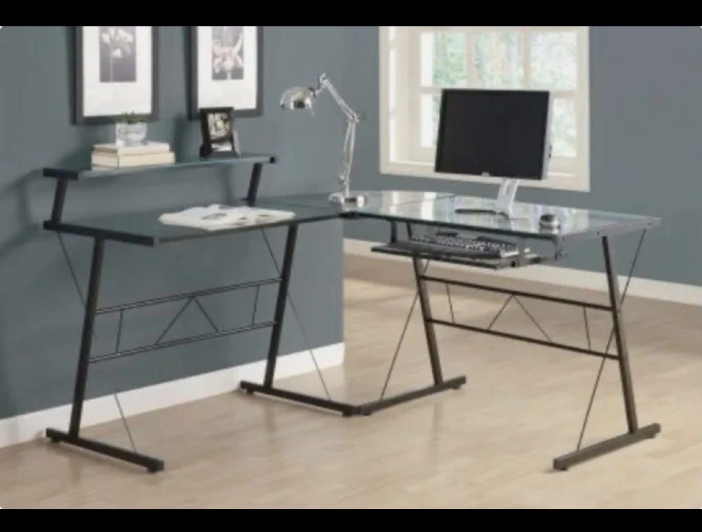 Corner desk with glass top and shelf. Black metal frame. Excellent condition.