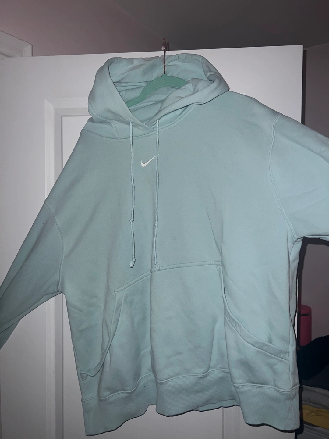 Light blue Nike hoodie with a white swoosh logo. Has a pouch pocket and a drawstring hood.