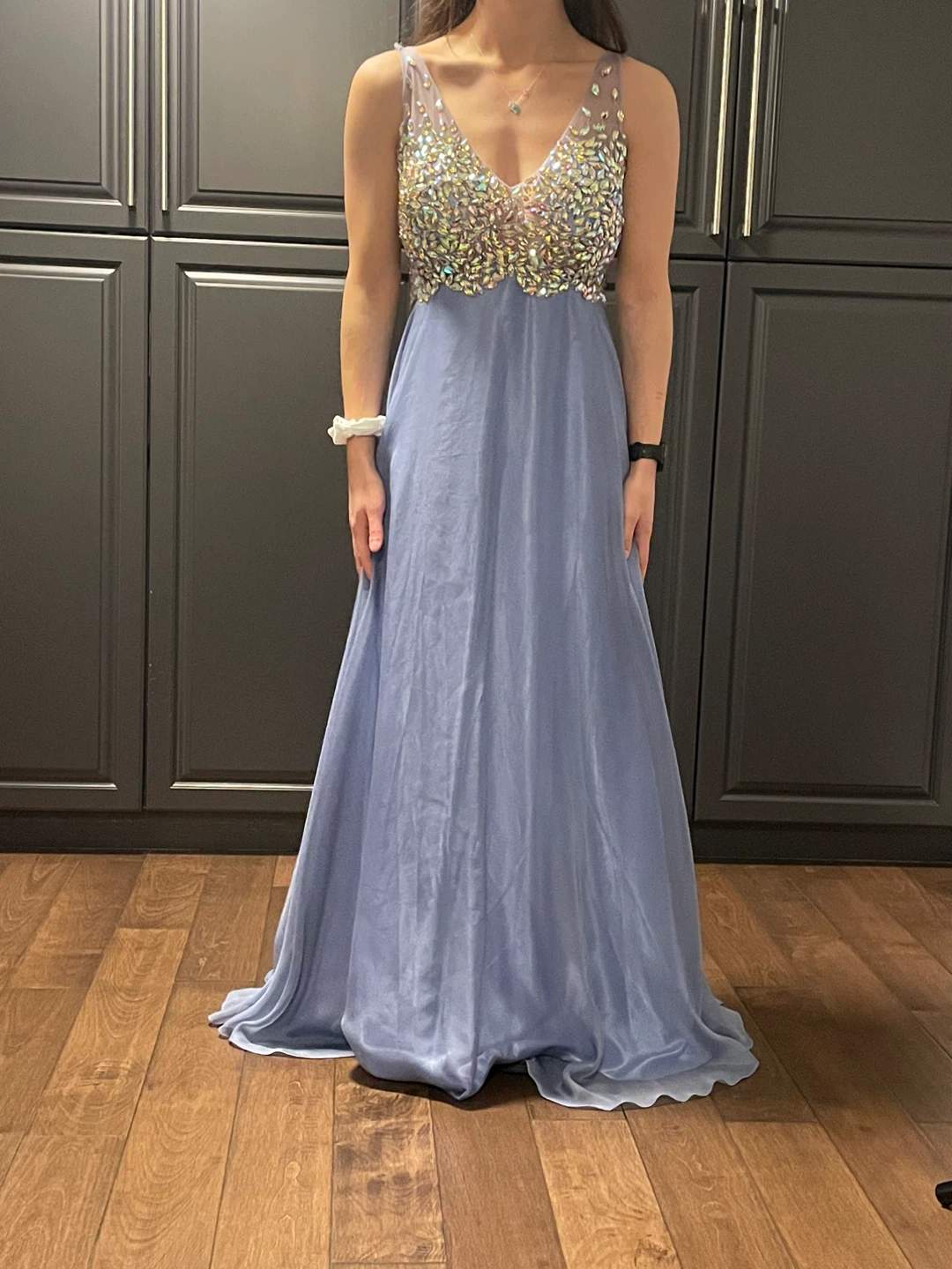 Long light blue dress with a V-neck and embellished bodice. The skirt is made of a flowing chiffon fabric. The dress has a satin lining.