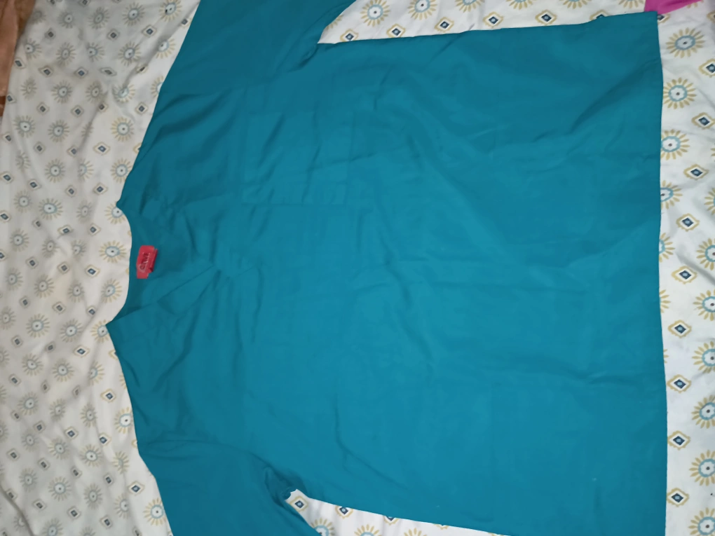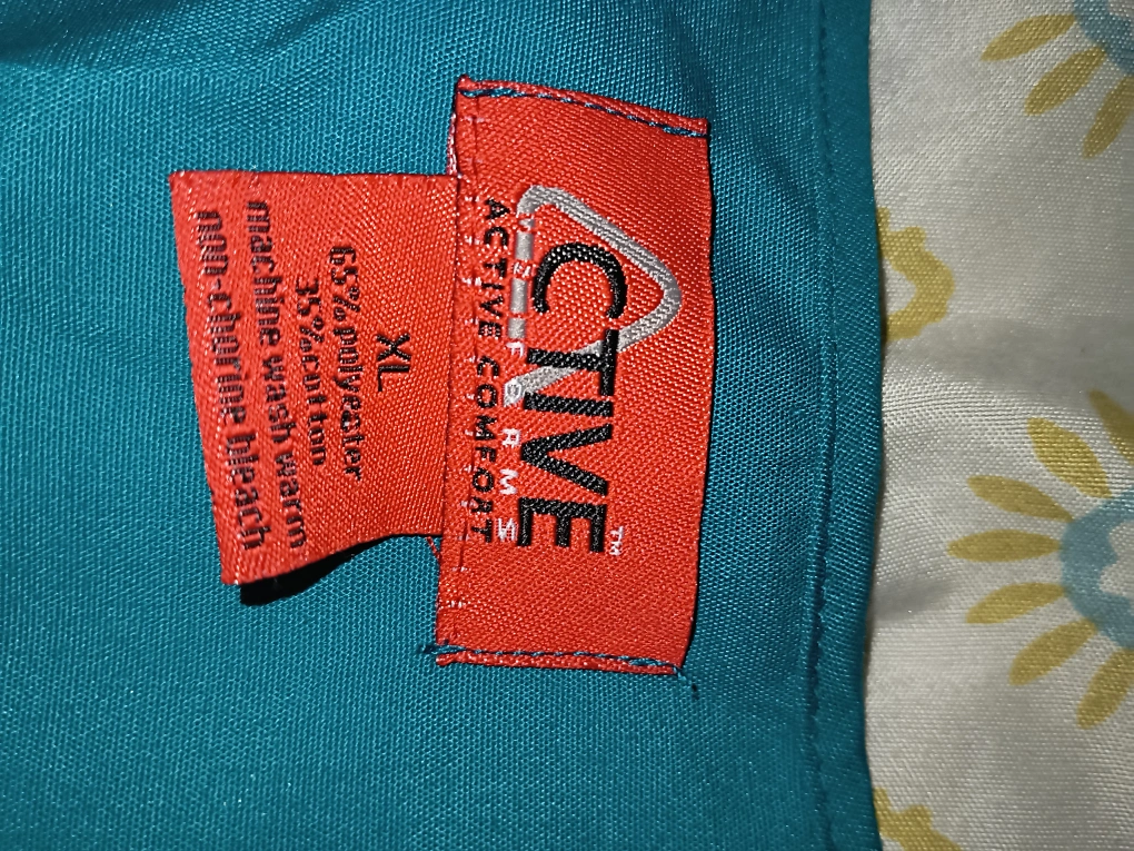 Teal V-neck short sleeve scrub top. Size XL. Machine wash warm, non-chlorine bleach.