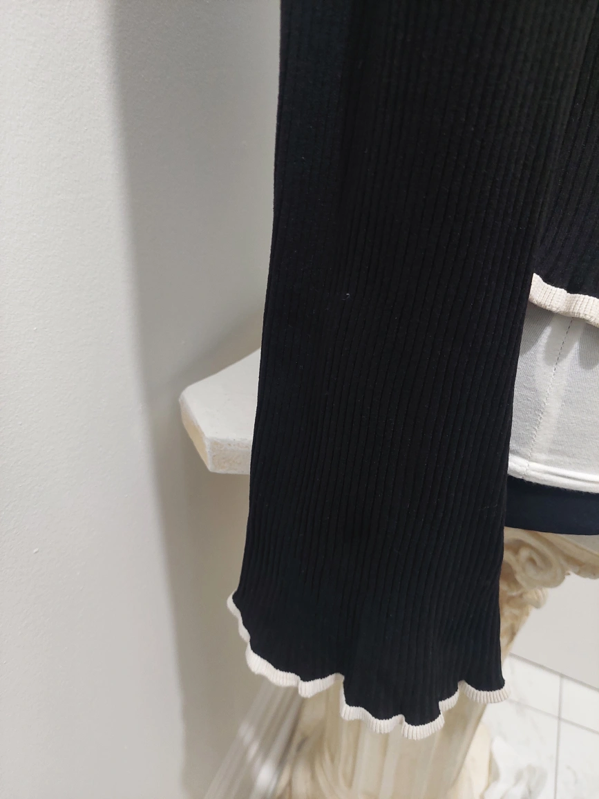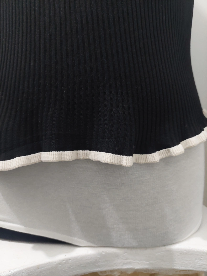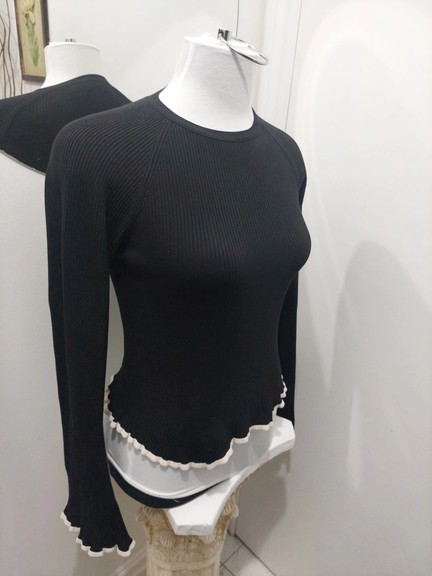 Beautiful Black ribbed knit top with white trim on the bottom and sleeves. Long sleeves. Size M.
