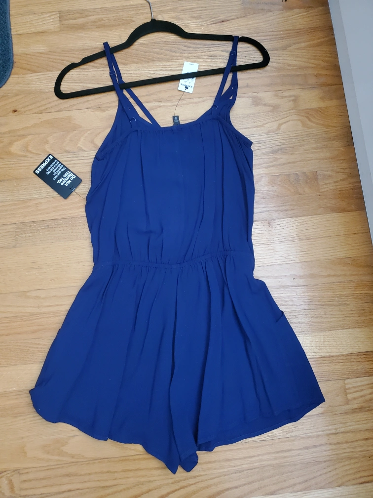 Navy blue romper with adjustable straps and pockets. Size XS/TP
