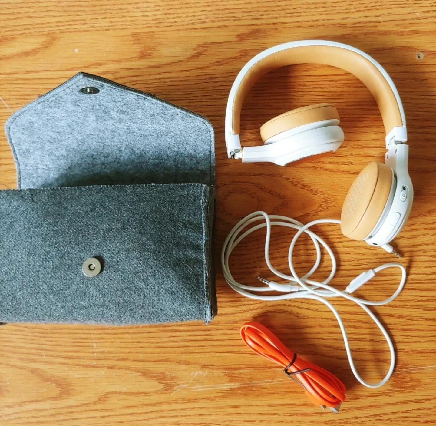 White wireless headphones with a gray carrying case. Includes a white audio cable and an orange charging cable.