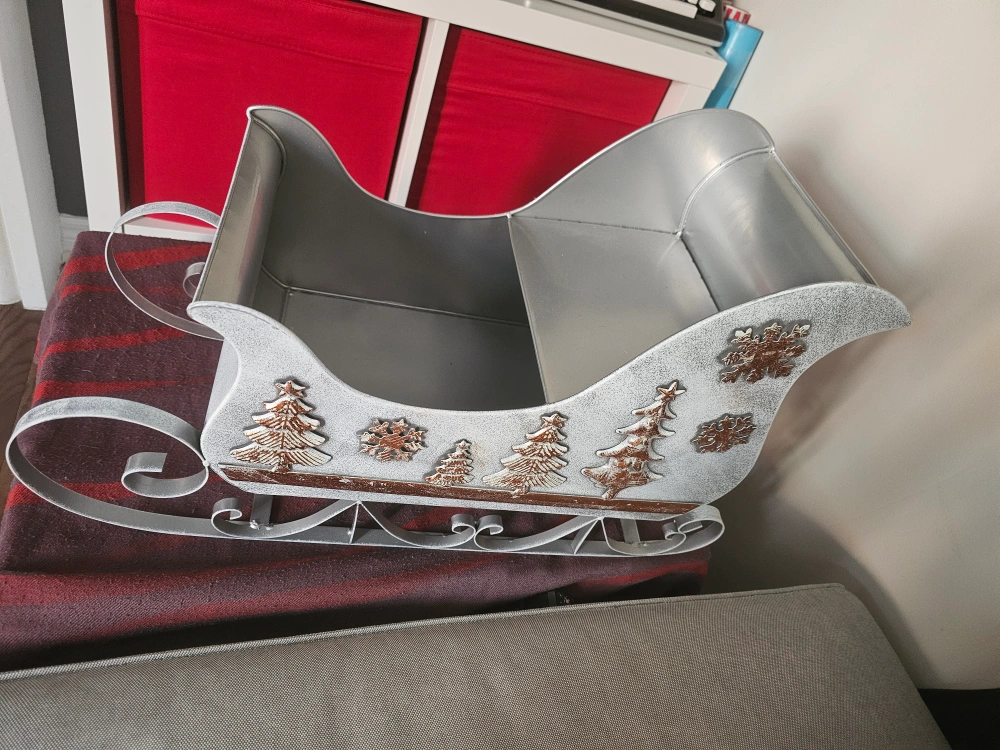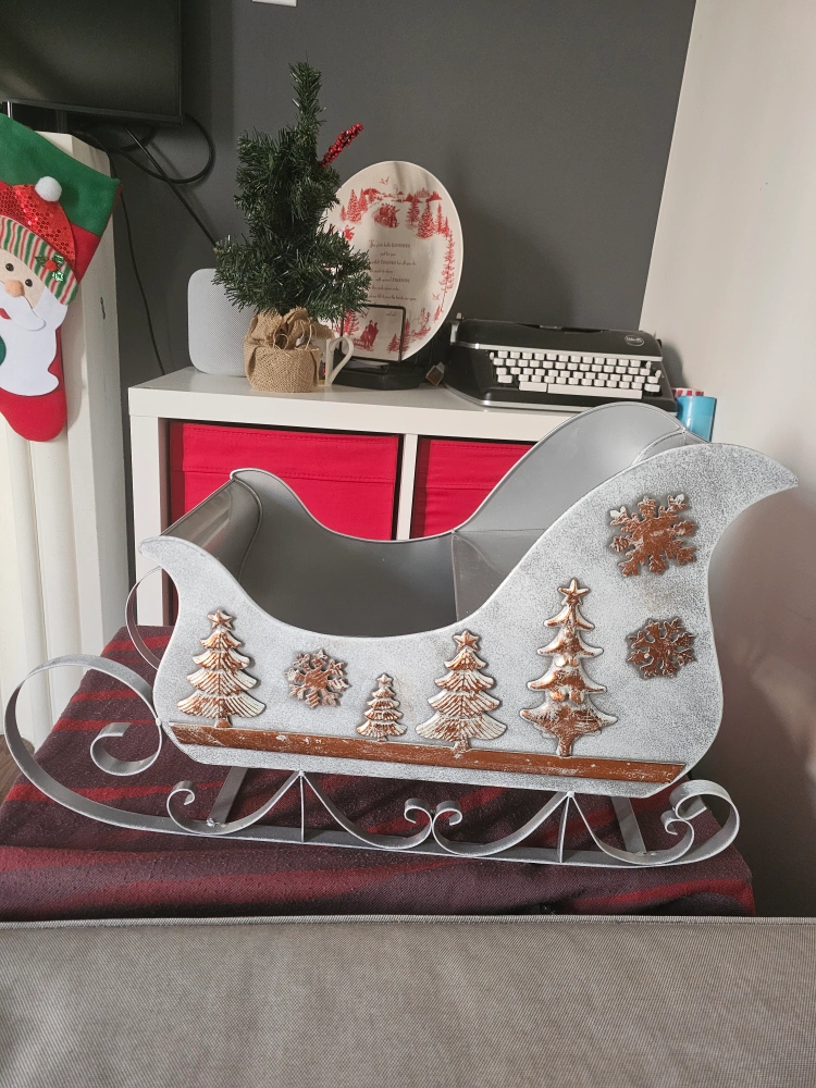 Metal sleigh with Christmas decor. Perfect for holding ornaments, gifts or plants. you can put Christmas goodies inside and wrap it with plastic and ribbons into à Christmas giftbox.