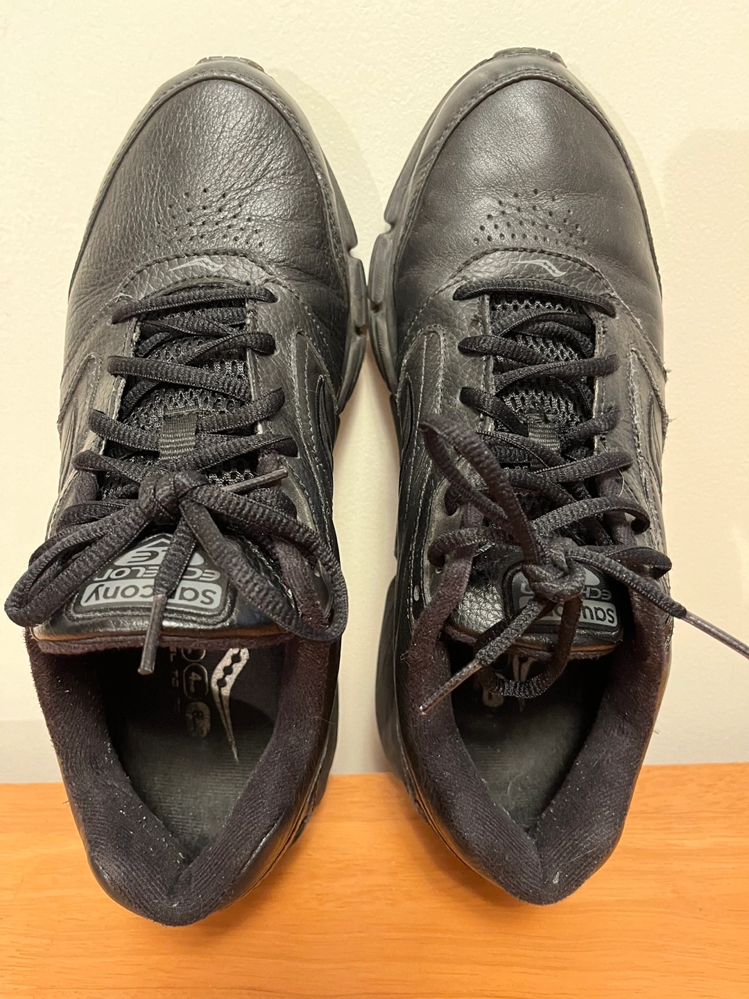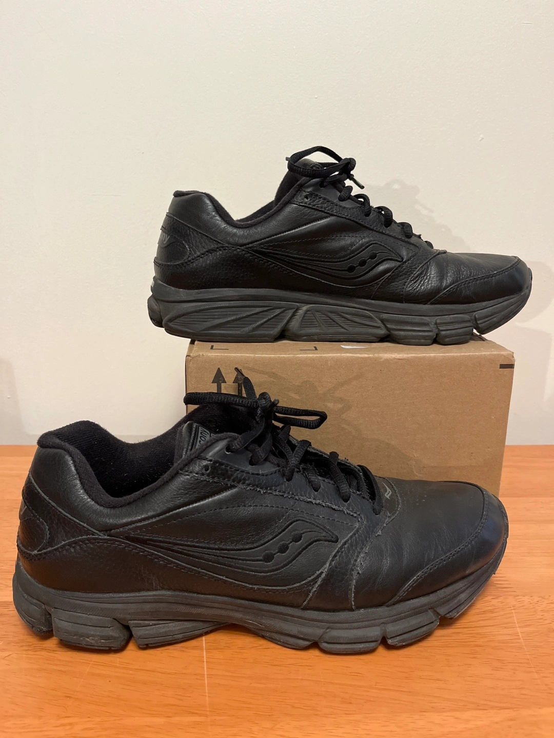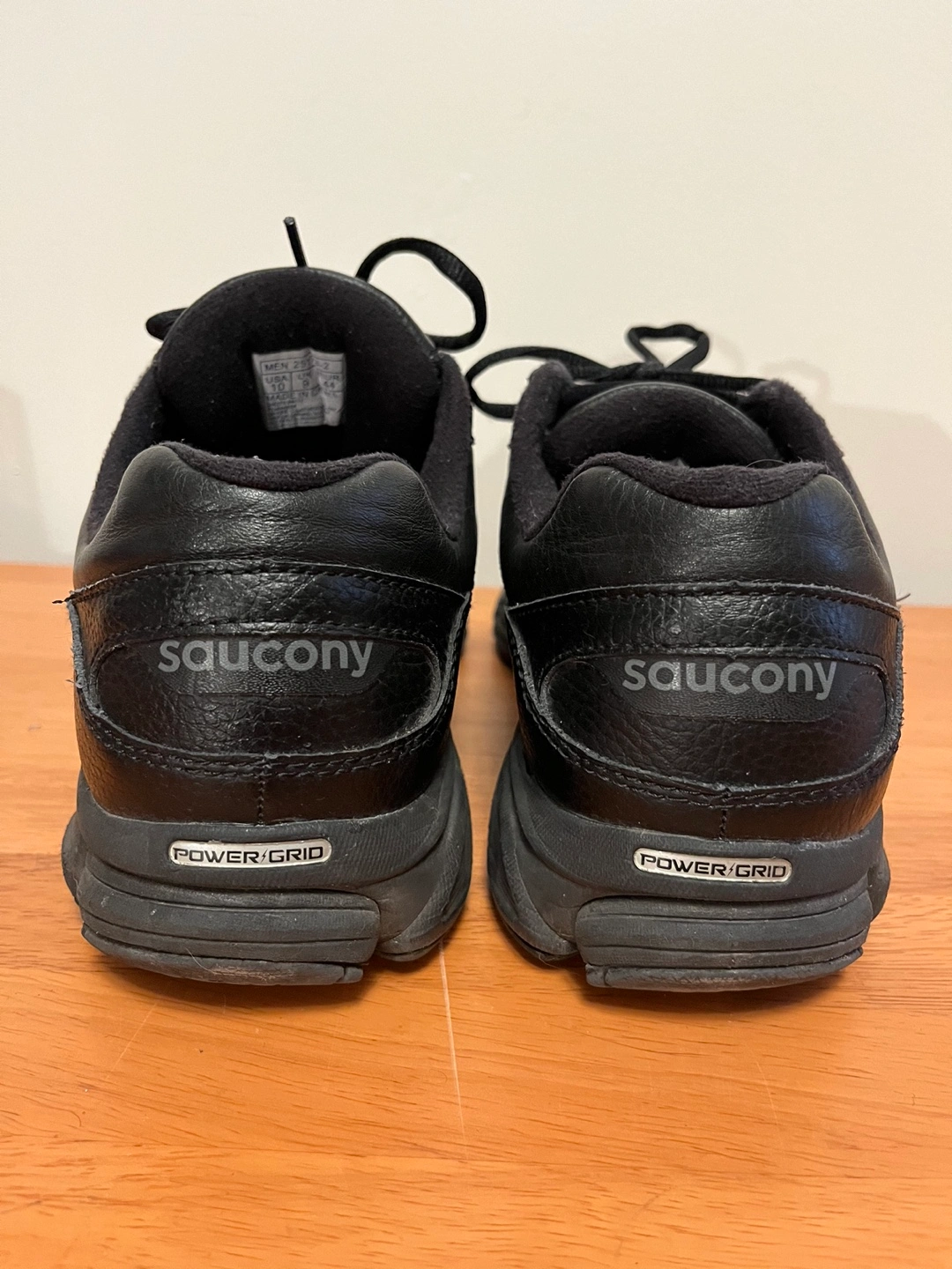 Black leather running shoe with fabric lining and power grid cushioning for support and comfort.