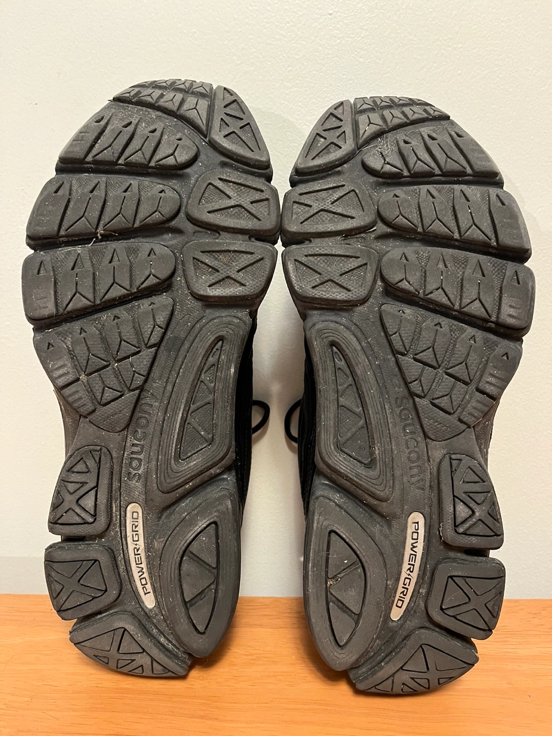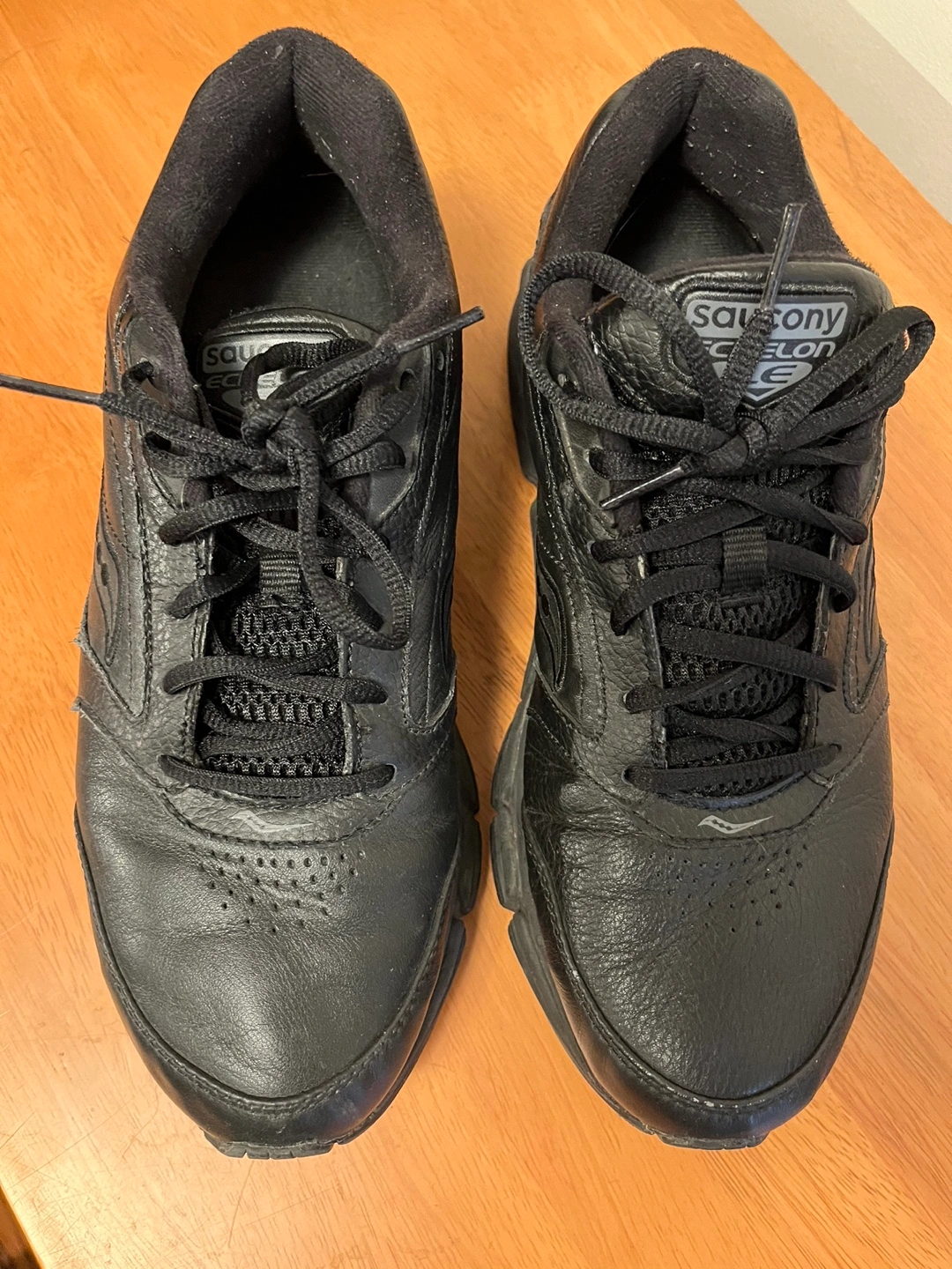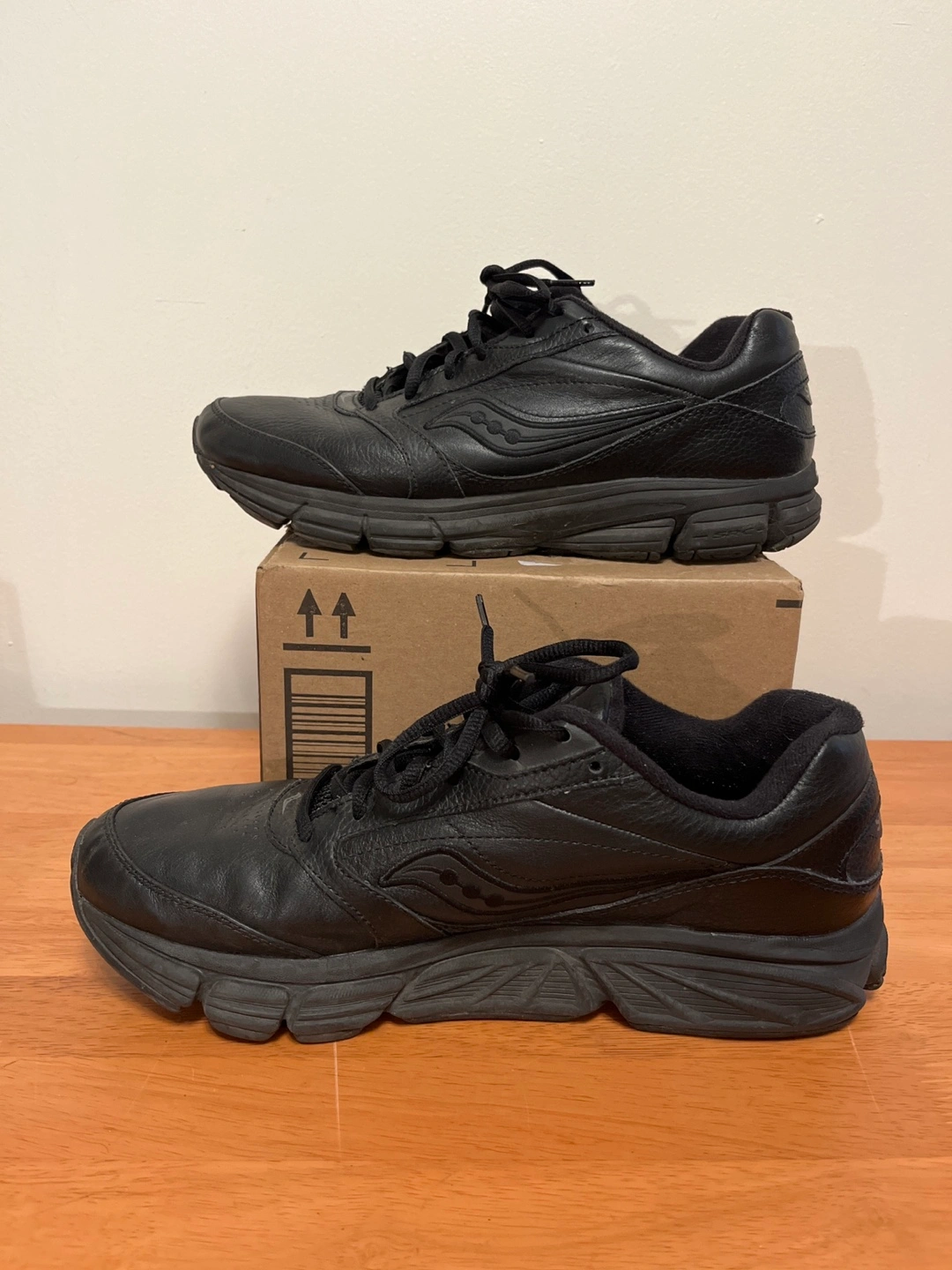 Black leather running shoe with fabric lining and power grid cushioning for support and comfort.