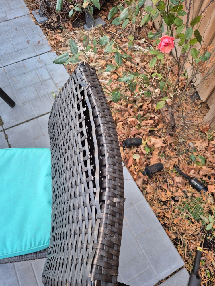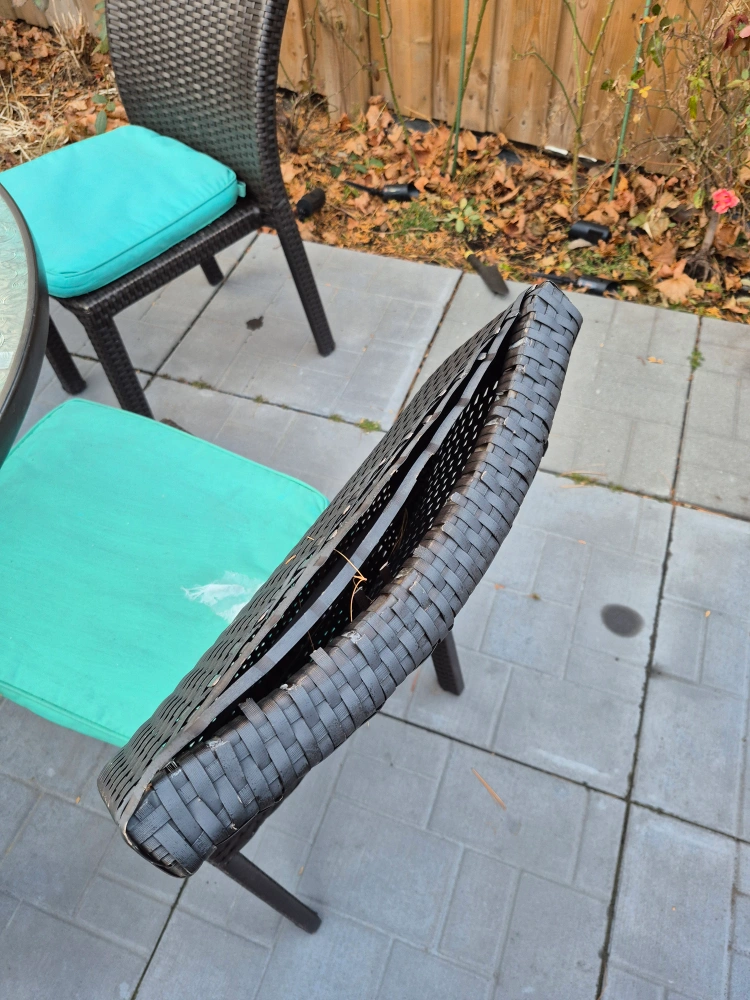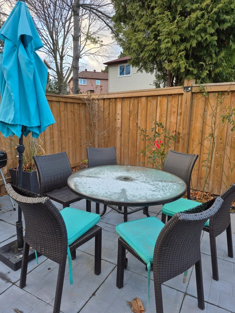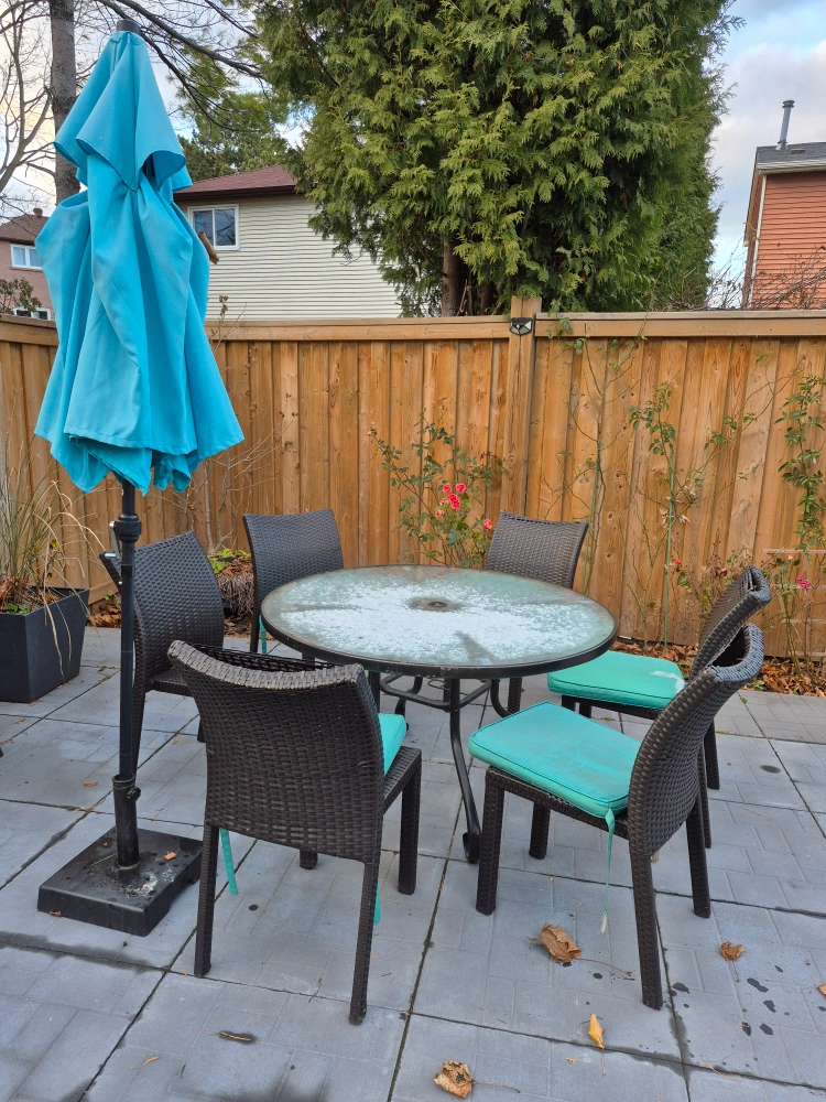Glass top table with 6 chairs and umbrella. Chairs have teal cushions. Some wear and tear on the chairs. 5 chairs have damage but repair kit could be repaired. pick up only no delivery. fastest pickup is preferred.