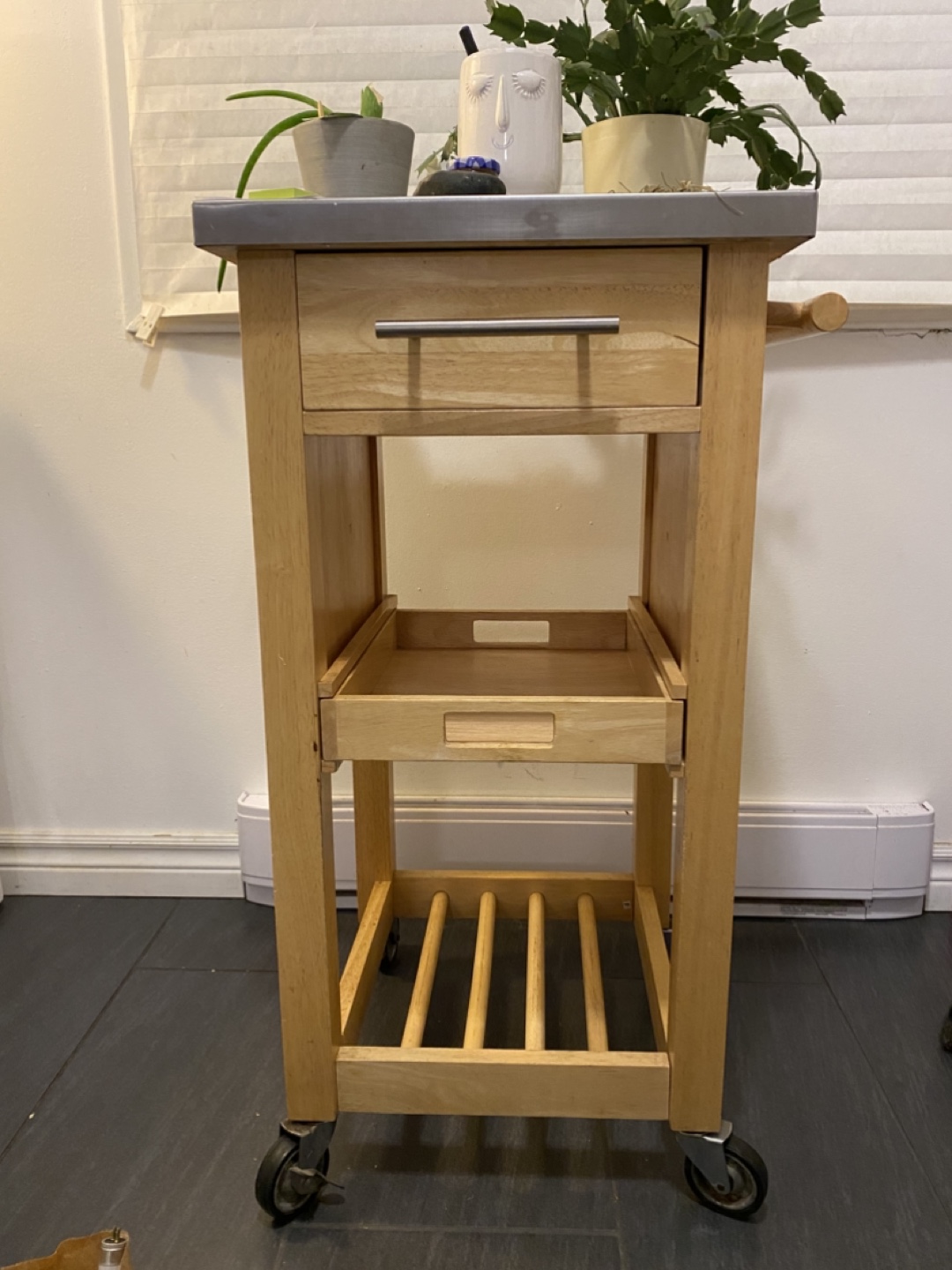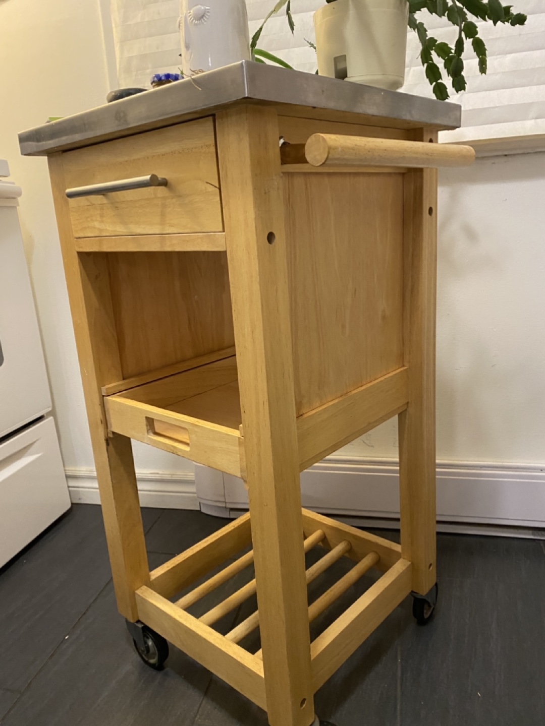 Buy & SellKitchen CartKitchen Cart$50Wooden kitchen cart with stainless steel top. One drawer with handle, a pull out tray, and rungs on bottom for wine bottles.WHERE TO MEETRexall at Adelaide and FanshaweView MapSELLERAnnaStoney Creek12712 reviews3 chats·6 favorites·123 viewsSEND CHAT TO SELLERHi Anna! I’m interested in your listing.Hi Anna! I’m interested in your listing.Get the Karrot app to chatSign In to chat