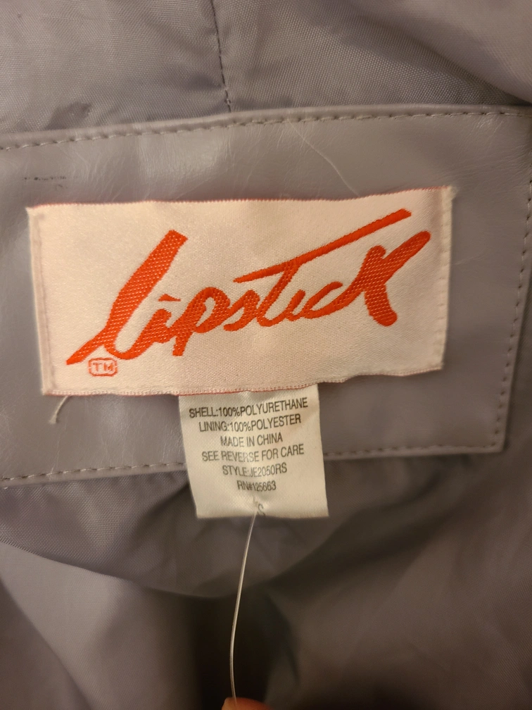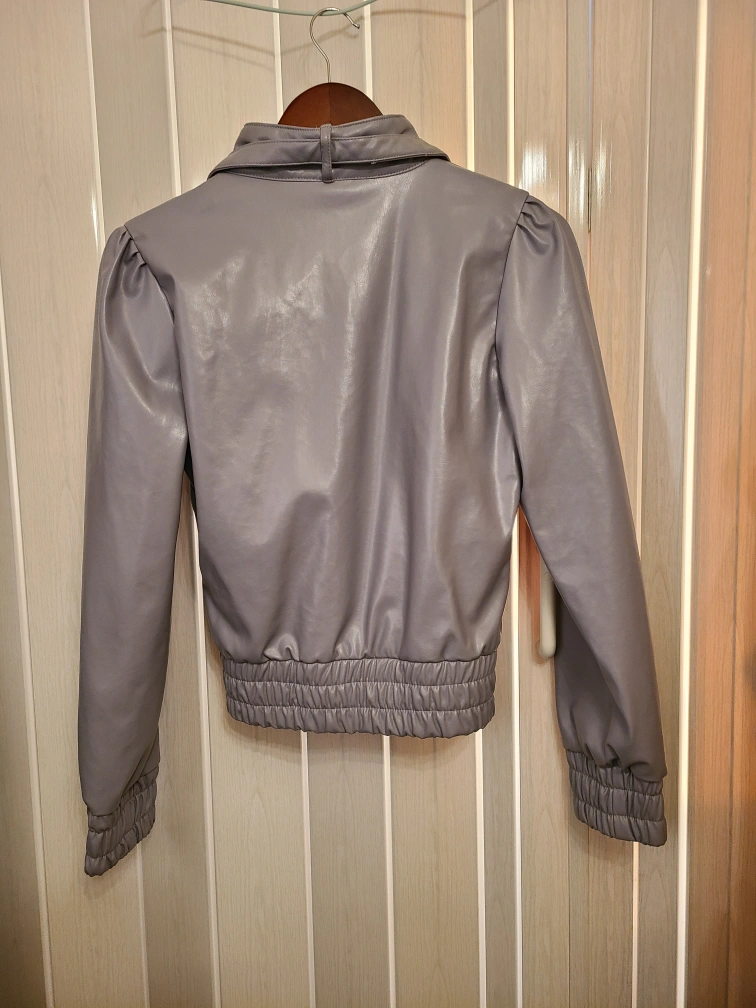 Grey faux leather jacket with a zipper closure. It has a stand-up collar and long sleeves.