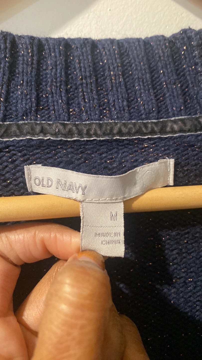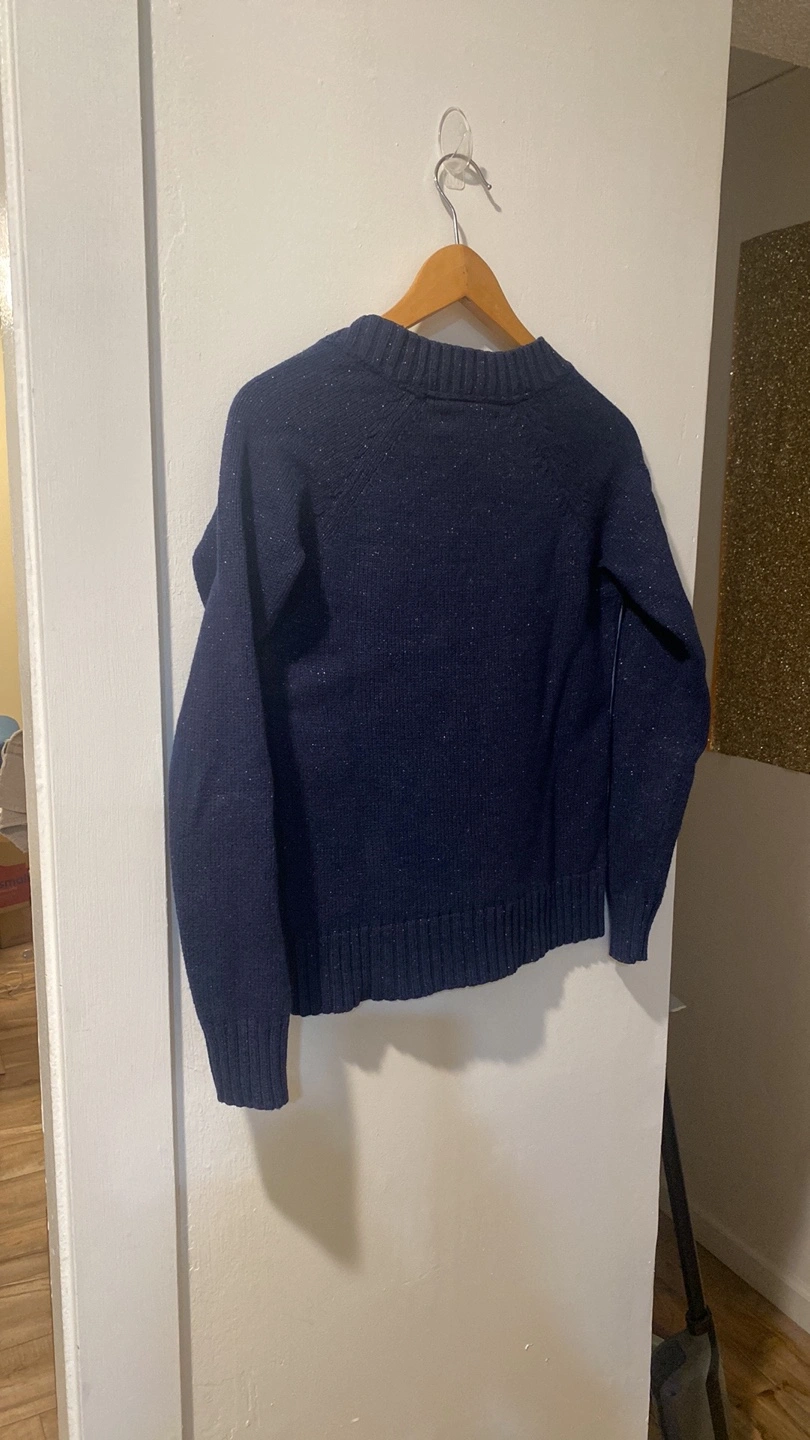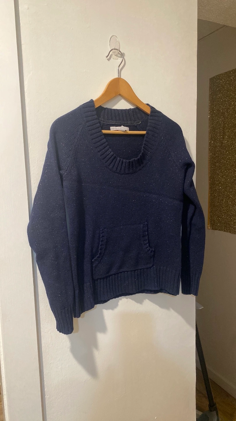 209Blue sweater with a small pocket on the front. Has a subtle copper sparkle throughout. Long sleeves.